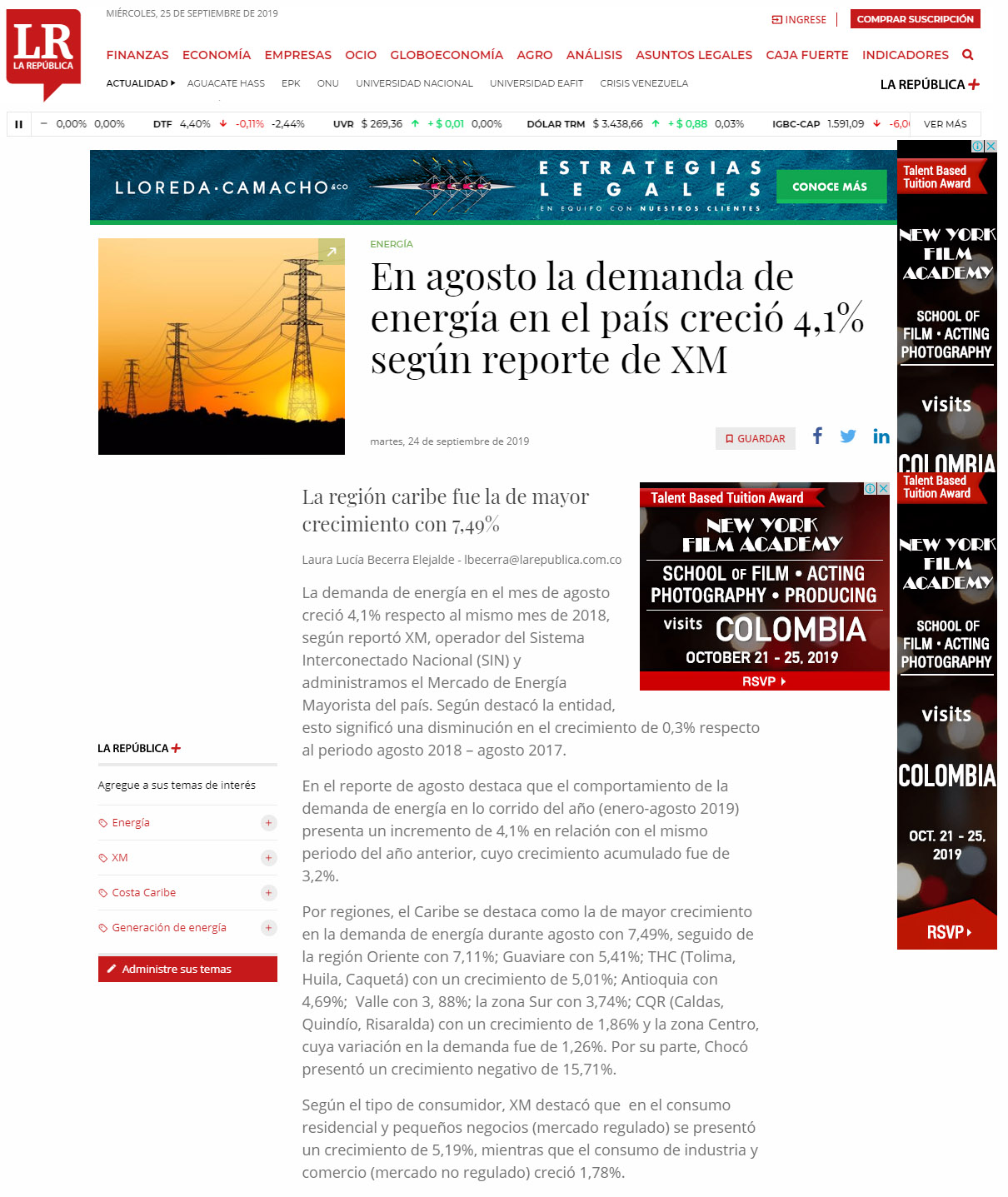 EN AGOSTO LA DEMANDA DE ENERGÍA EN EL PAÍS CRECIÓ 4,1% SEGÚN REPORTE DE XM, LAREPUBLICA CO