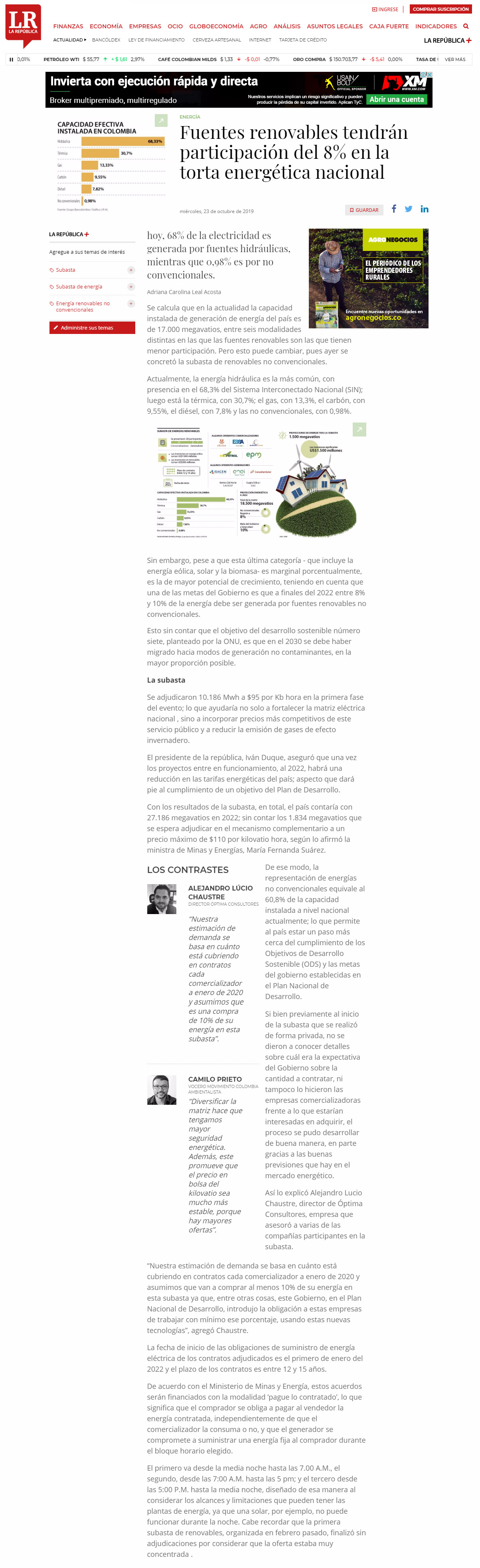 FUENTES RENOVABLES TENDRÁN PARTICIPACIÓN DEL 8% EN LA TORTA ENERGÉTICA, LA REPUBLICA CO