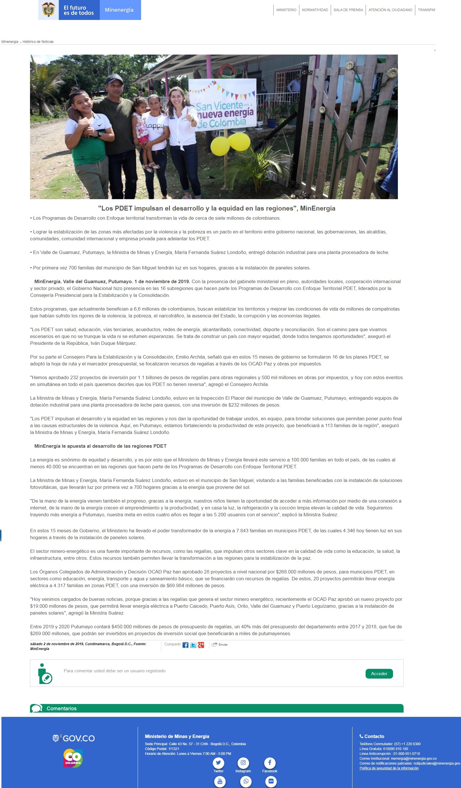 La Ministra de Minas y Energía, María Fernanda Suárez Londoño, estuvo en el municipio de San Miguel, Putumayo, visitando a las familias beneficiadas con la instalación de paneles solares que hacen parte del Programa de Desarrollo con Enfoque Territorial-PDET.