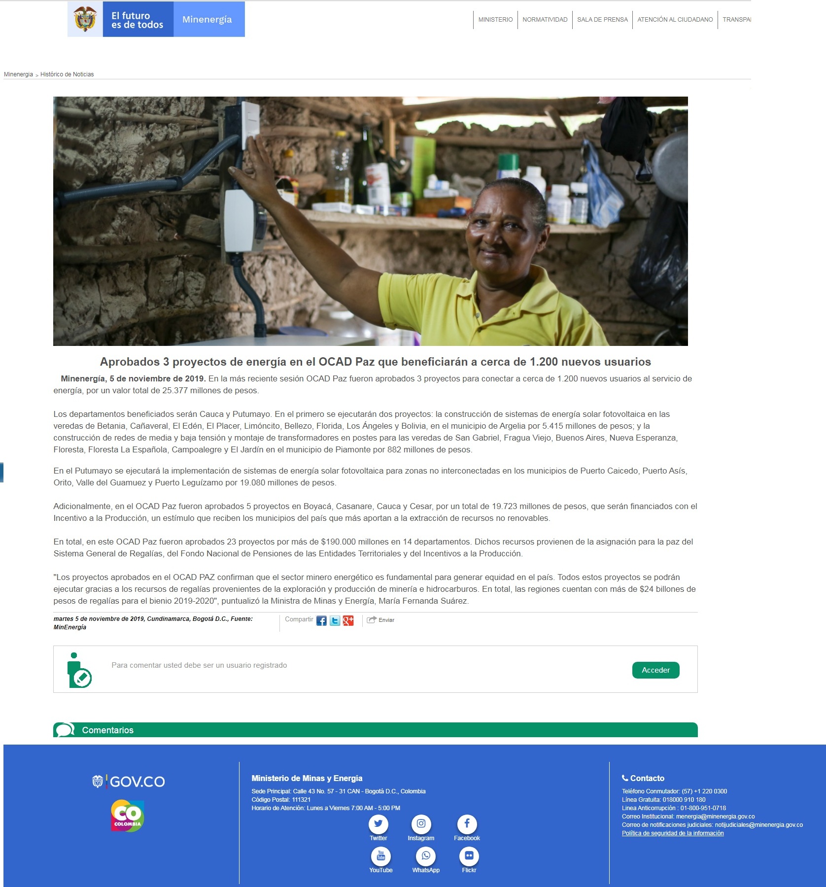 En la más reciente sesión OCAD Paz fueron aprobados 3 proyectos para conectar a cerca de 1.200 nuevos usuarios al servicio de energía, por un valor total de 25.377 millones de pesos, en los departamentos de Cauca y Putumayo.