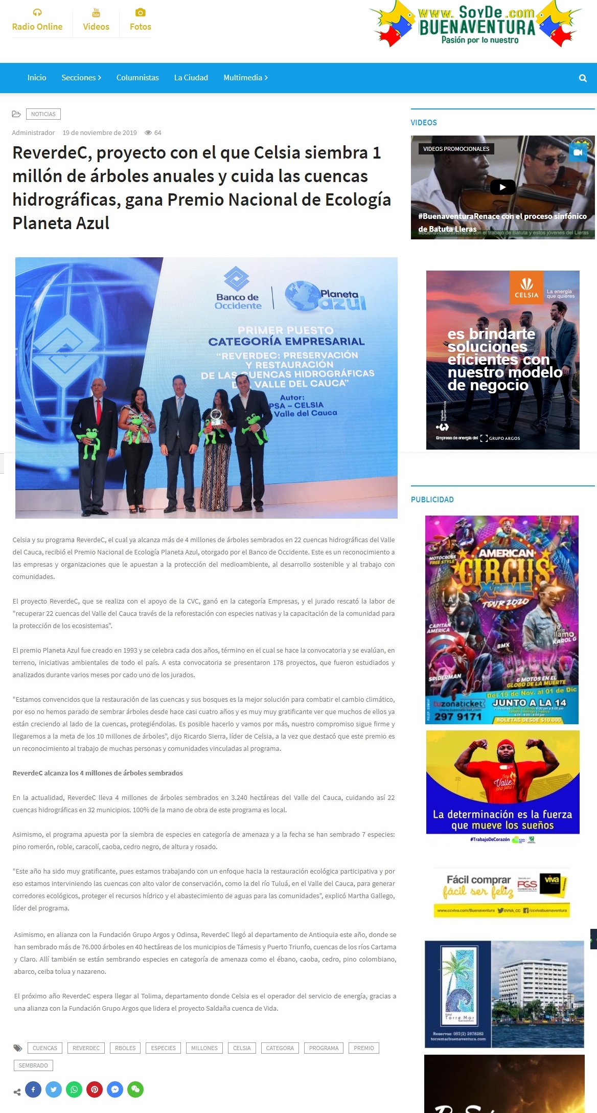 Celsia y su programa ReverdeC recibió el Premio Nacional de Ecología Planeta Azul otorgado por el Banco de Occidente. El proyecto ReverdeC, que se realiza con el apoyo de la CVC, ganó en la categoría Empresas, y el jurado rescató la labor de "recuperar 22 cuencas del Valle del Cauca través de la reforestación con especies nativas y la capacitación de la comunidad para la protección de los ecosistemas".