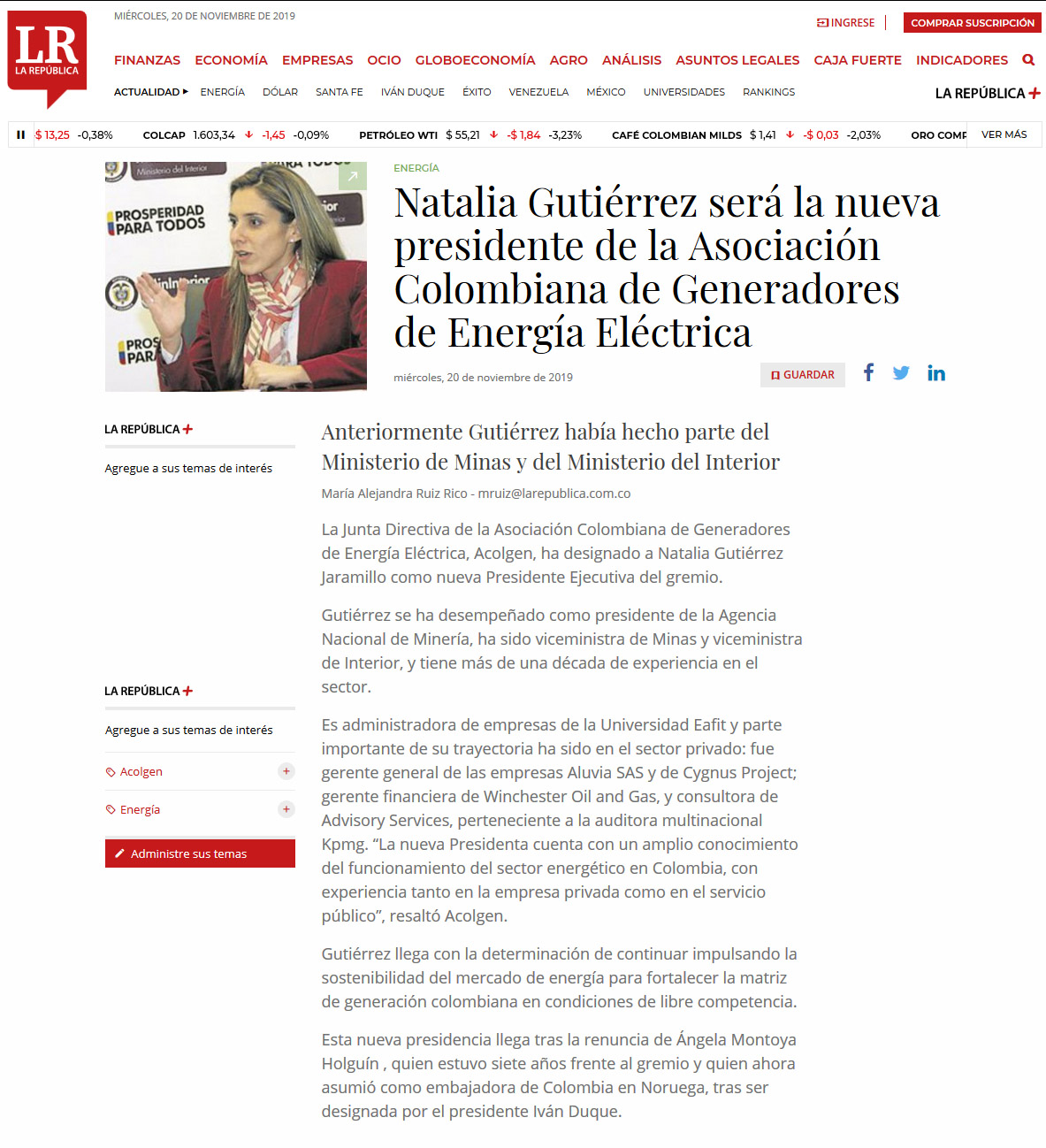 La Junta Directiva de la Asociación Colombiana de Generadores de Energía Eléctrica, Acolgen, ha designado a Natalia Gutiérrez Jaramillo como nueva Presidente Ejecutiva del gremio.
