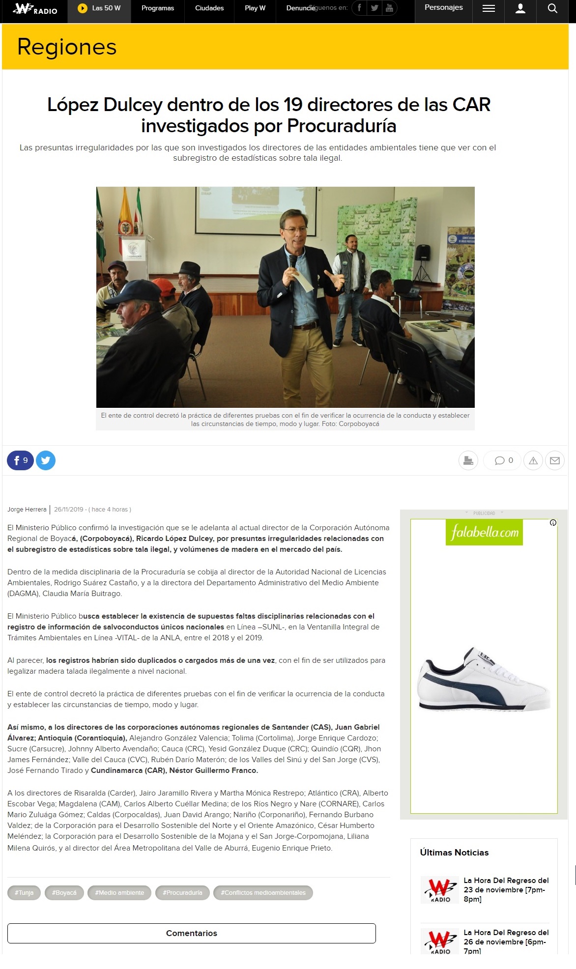 La Procuraduría General de la Nación confirmó la investigación que se le adelanta al actual director de la Corporación Autónoma Regional de Boyacá, Ricardo López Dulcey, así como a otros directores de las CAR entre los cuales se encuentra el director de la CVCV, Ruben Dario Materón.