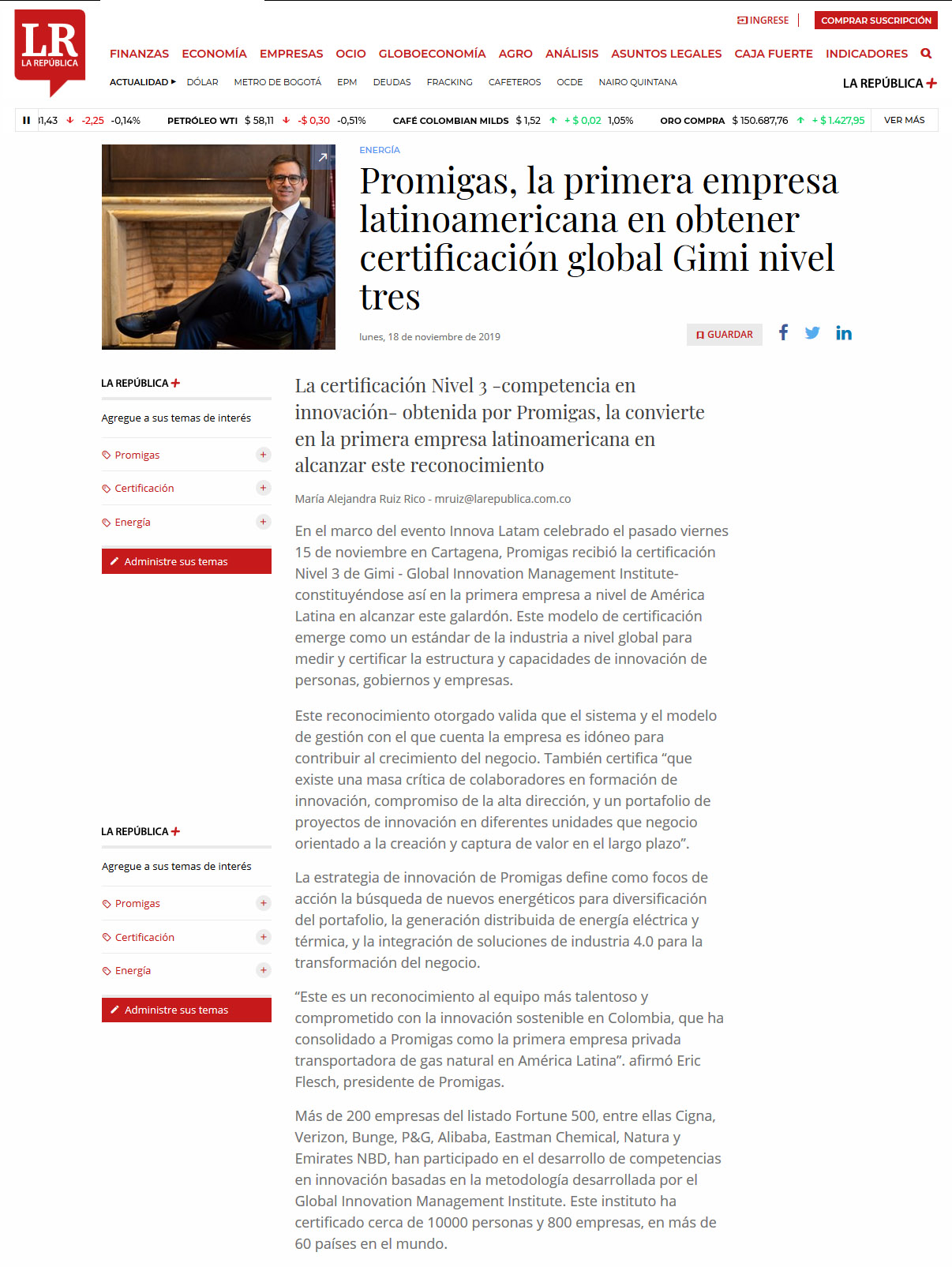 En el marco del evento Innova Latam celebrado el pasado viernes 15 de noviembre en Cartagena, Promigas recibió la certificación Nivel 3 de Gimi - Global Innovation Management Institute- constituyéndose así en la primera empresa a nivel de América Latina en alcanzar este galardón. Este modelo de certificación emerge como un estándar de la industria a nivel global para medir y certificar la estructura y capacidades de innovación de personas, gobiernos y empresas.