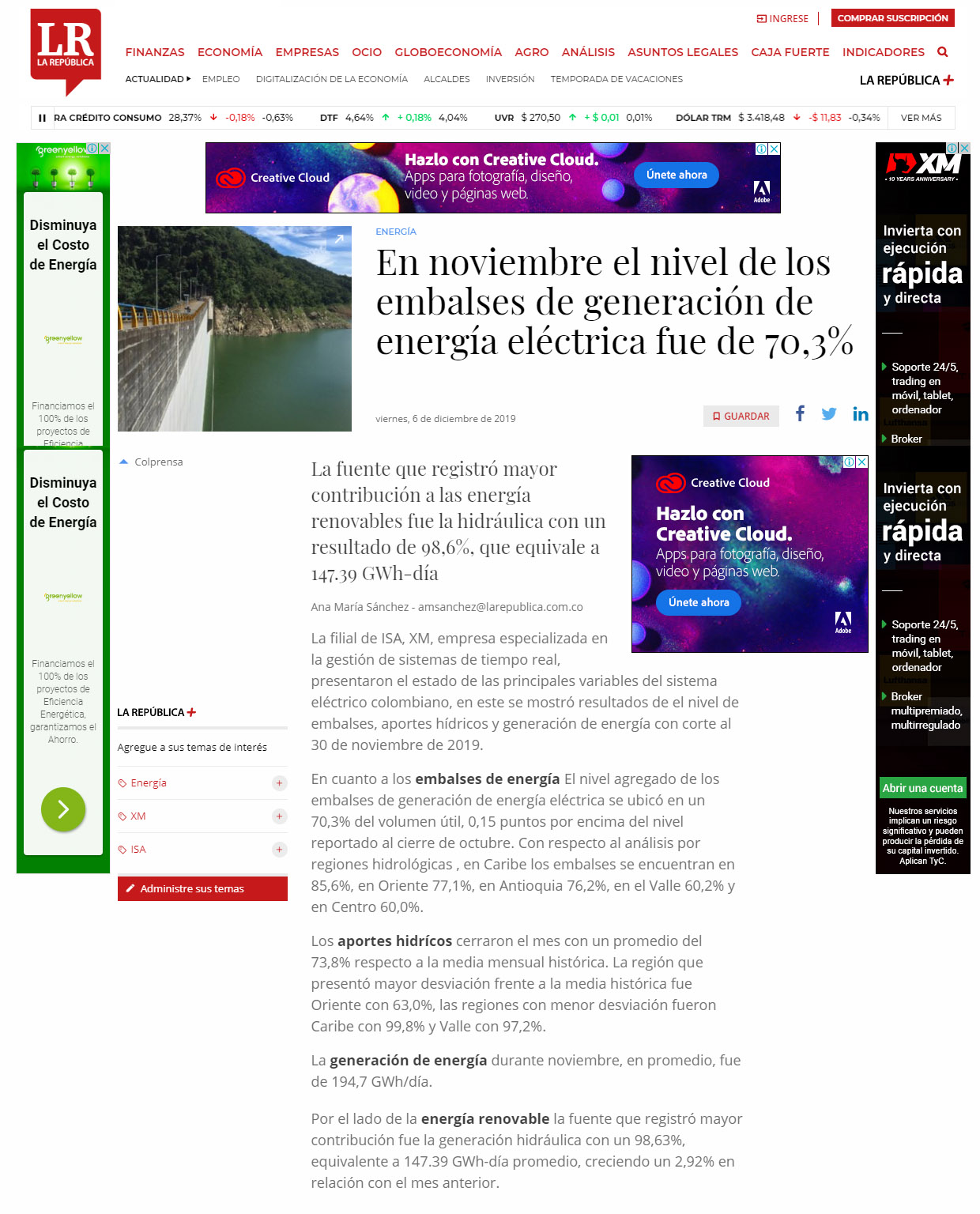 La filial de ISA, XM, empresa especializada en la gestión de sistemas de tiempo real, presentaron el estado de las principales variables del sistema eléctrico colombiano, en este se mostró resultados de el nivel de embalses, aportes hídricos y generación de energía con corte al 30 de noviembre de 2019.