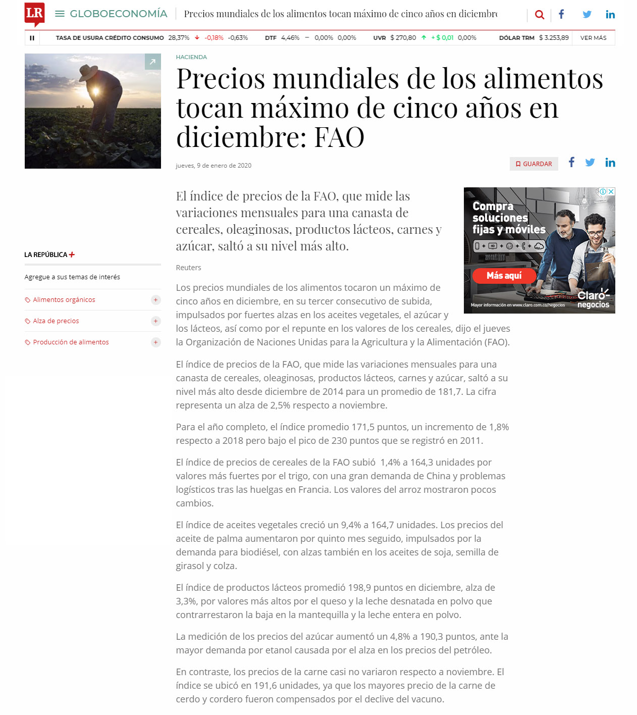 PRECIOS MUNDIALES DE ALIMENTOS TOCA MÁXIMO DE 5AÑOS EN DICIEMBRE, LAREPUBLICA CO