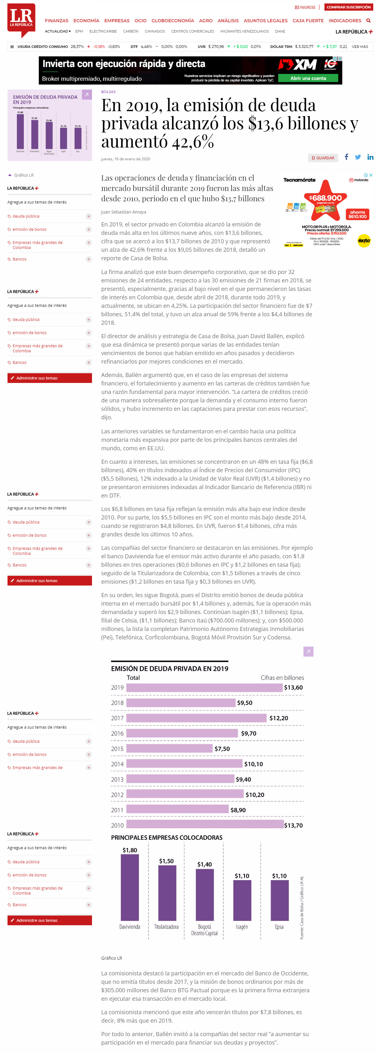 EN 2019, EMISIÓN DE DEUDA PRIVADA ALCANZO LOS 13,6 BILLONES, LAREPUBLICA CO