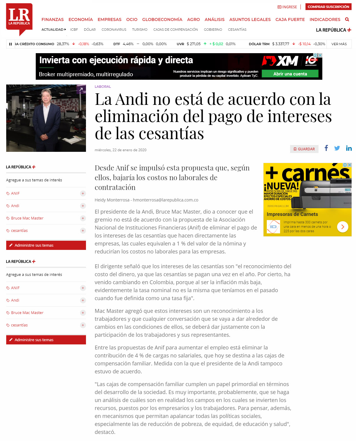 El presidente de la Andi, Bruce Mac Master, dio a conocer que el gremio no está de acuerdo con la propuesta de la Asociación Nacional de Instituciones Financieras (Anif) de eliminar el pago de los intereses de las cesantías que hacen directamente las empresas, las cuales equivalen a 1 % del valor de la nómina y reducirían los costos no laborales para las empresas.