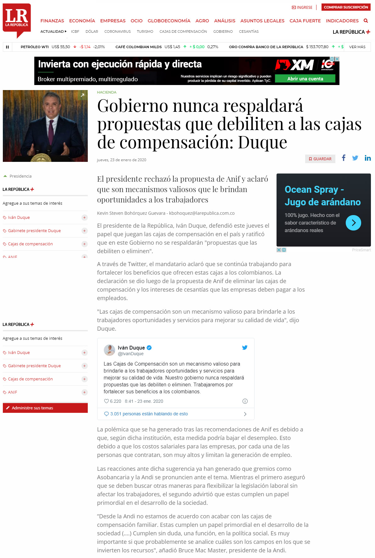 A través de Twitter, el mandatario aclaró que se continúa trabajando para fortalecer los beneficios que ofrecen estas cajas a los colombianos. La declaración se dio luego de la propuesta de Anif de eliminar las cajas de compensación y los intereses de cesantías que las empresas deben pagar a los empleados.