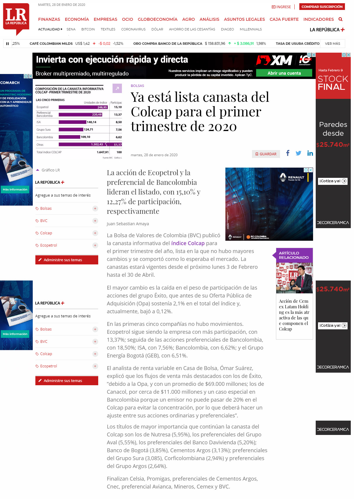 ESTÁ LISTA CANASTA COLCAP PARA PRIMER TRIMESTRE DE 2020, LAREPUBLICA CO