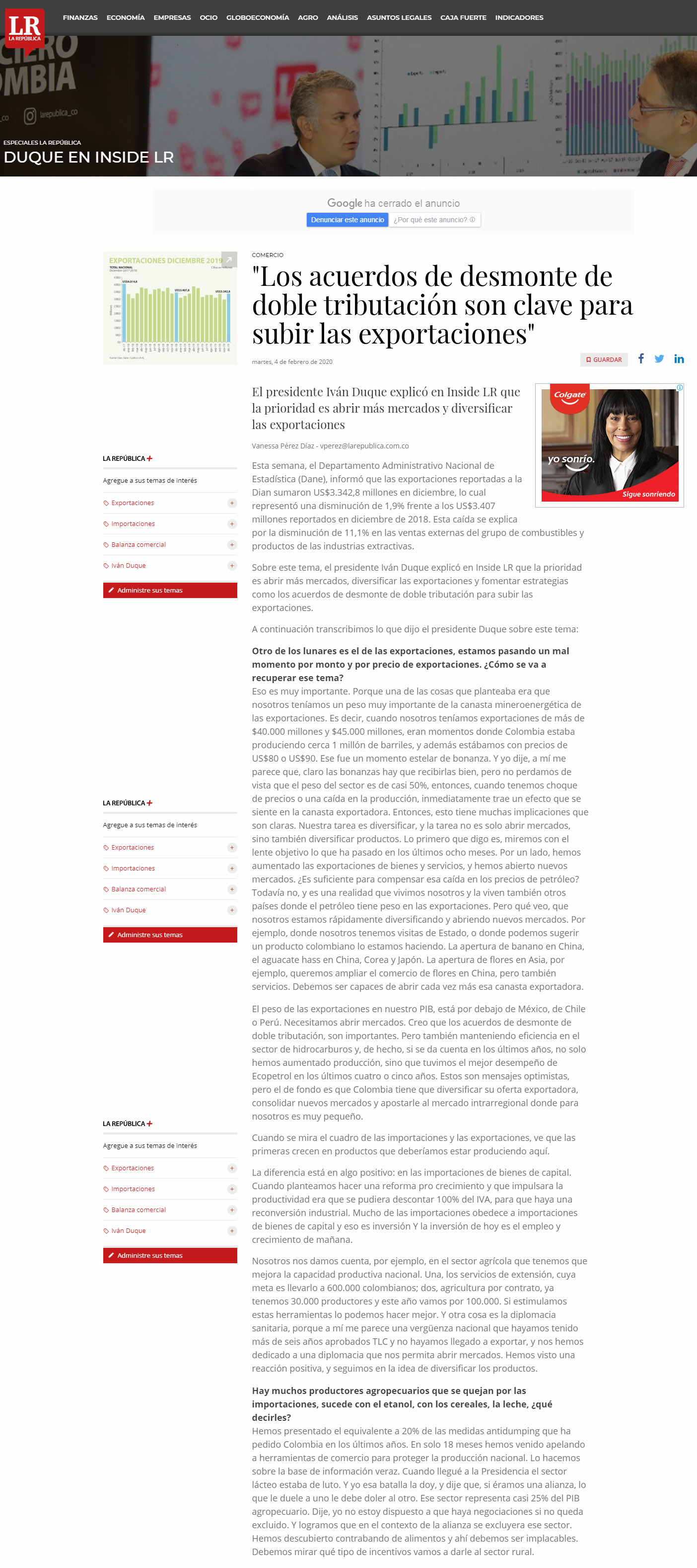 LOS ACUERDOS DE DESMONTE DE DOBLE TRIBUTACIÓN SON CLAVE SUBIR LAS EXPORTACIONES, LAREPUBLICA CO