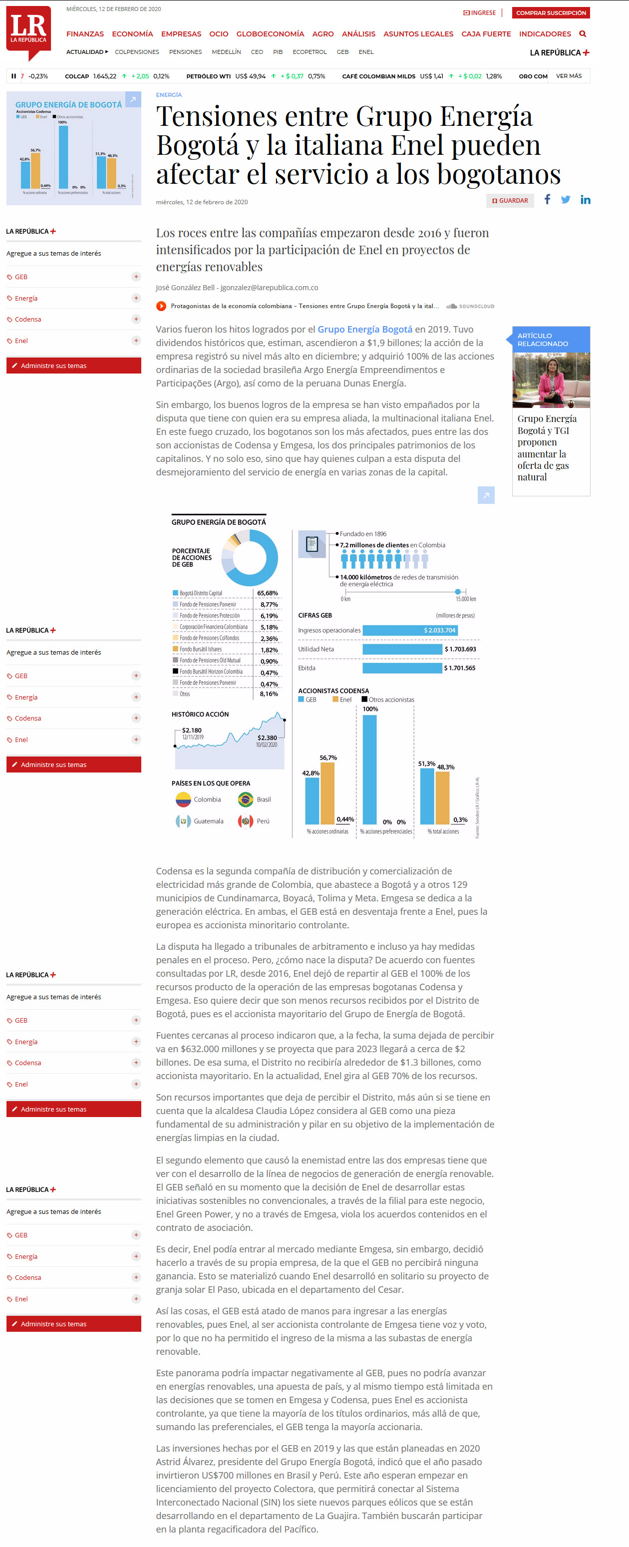 TENSIONES ENTRE GEB Y ENEL PUEDE AFECTAR EL SERVICIO A LOS BOGOTANOS, LAREPUBLICA CO