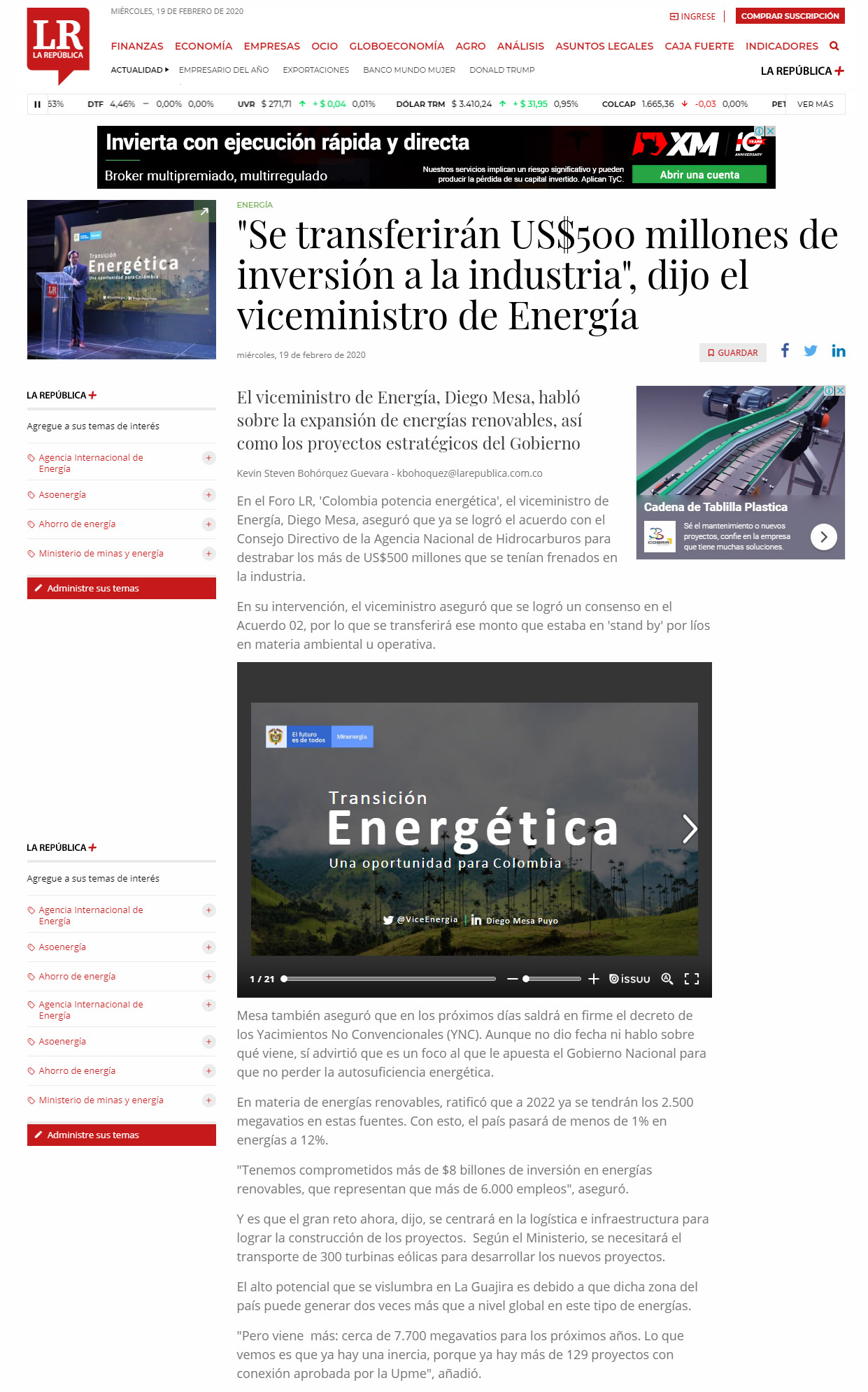 En el Foro LR, 'Colombia potencia energética', el viceministro de Energía, Diego Mesa, aseguró que ya se logró el acuerdo con el Consejo Directivo de la Agencia Nacional de Hidrocarburos para destrabar los más de US$500 millones que se tenían frenados en la industria.