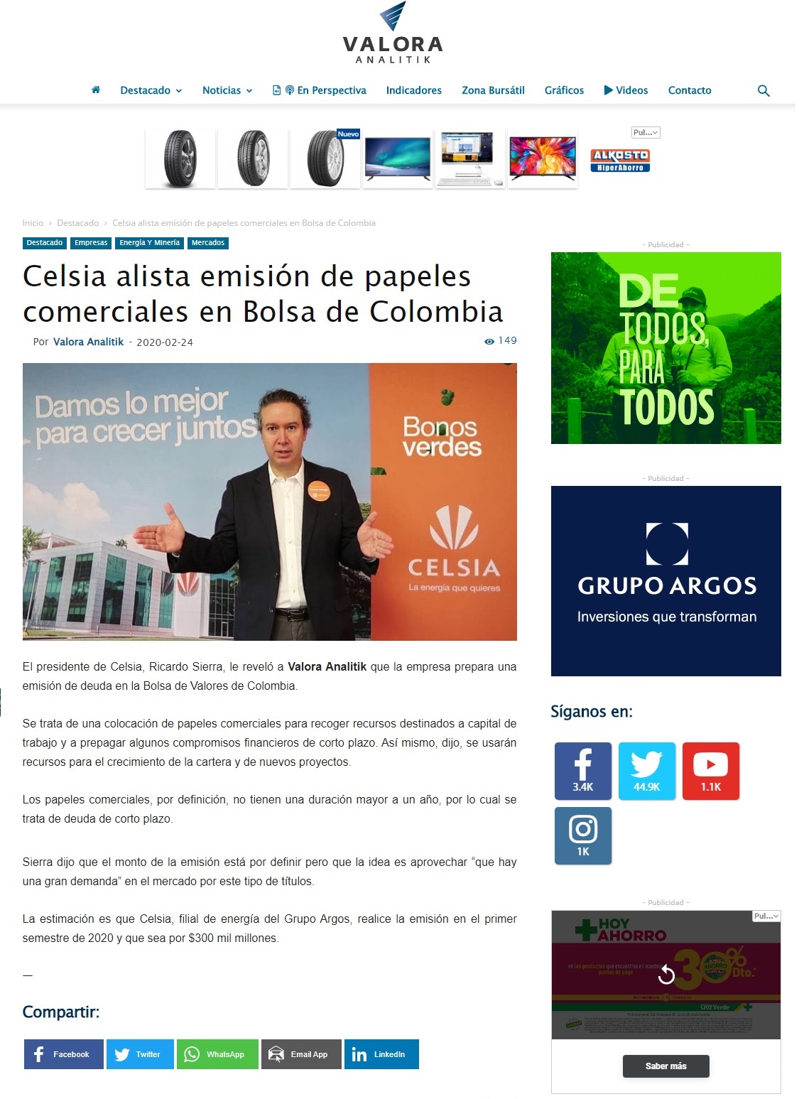 El presidente de Celsia, Ricardo Sierra, reveló que la empresa prepara una colocación de papeles comerciales en la Bolsa de Valores de Colombia para recoger recursos destinados a capital de trabajo.