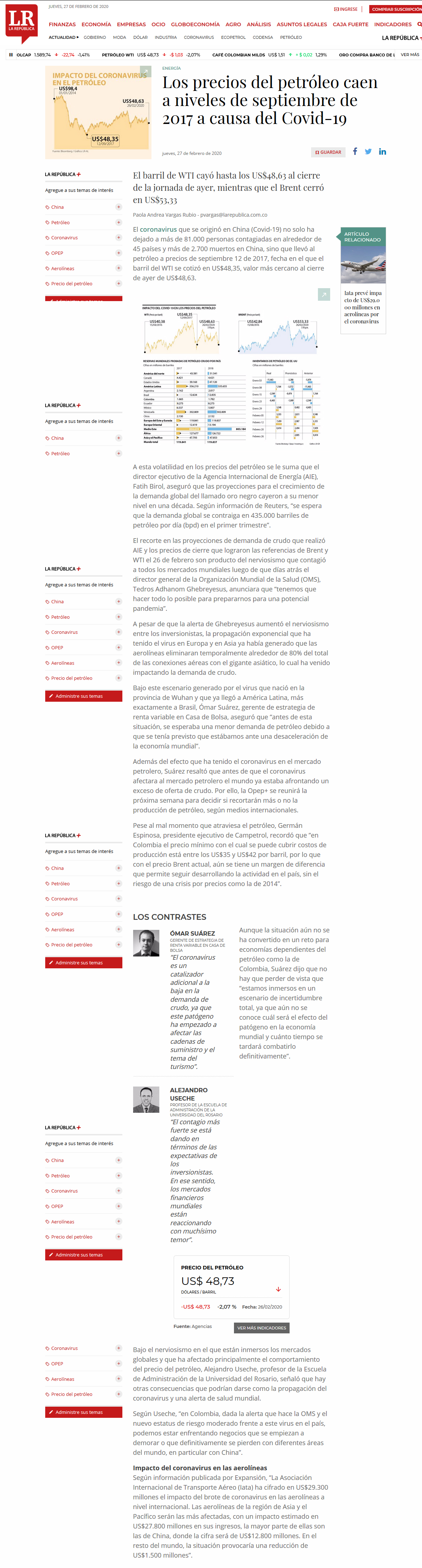 El coronavirus que se originó en China (Covid-19) no solo ha dejado a más de 81.000 personas contagiadas en alrededor de 45 países y más de 2.700 muertos en China, sino que llevó al petróleo a precios de septiembre 12 de 2017, fecha en el que el barril del WTI se cotizó en US$48,35, valor más cercano al cierre de ayer de US$48,63.