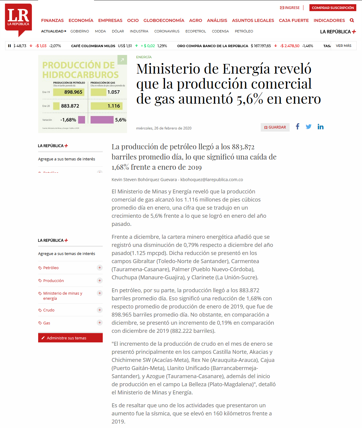 PRODUCCIÓN COMERCIAL DE GAS AUMENTÓ 5,6% EN ENERO, LAREPUBLICA CO