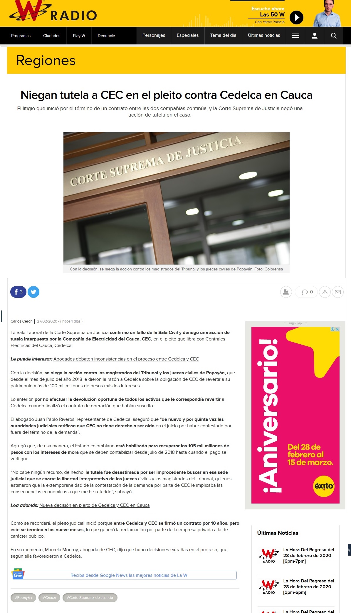 La Corte Suprema de Justicia denegó una acción de tutela interpuesta por la Compañía de Electricidad del Cauca, CEC, contra Cedelca.