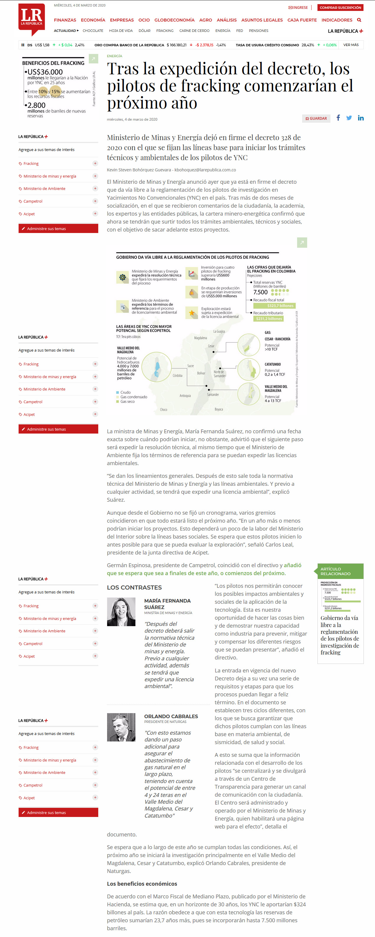PILOTOS DE FRACKING COMENZARÍAN EL PRÓXIMO AÑO, LAREPUBLICA CO