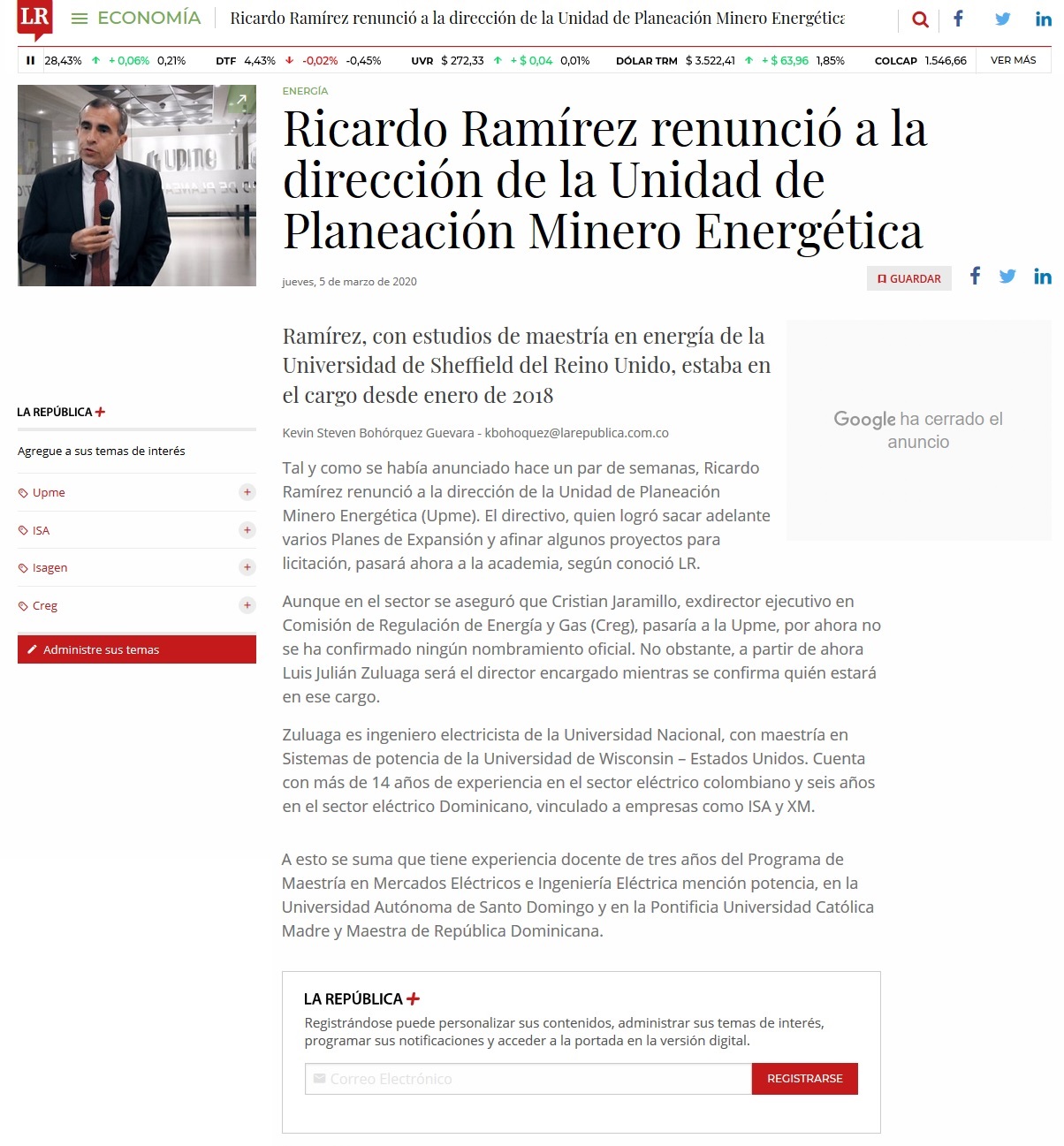 RICARDO RAMÍREZ RENUNCIÓ A LA DIRECCIÓN DE LA UPME