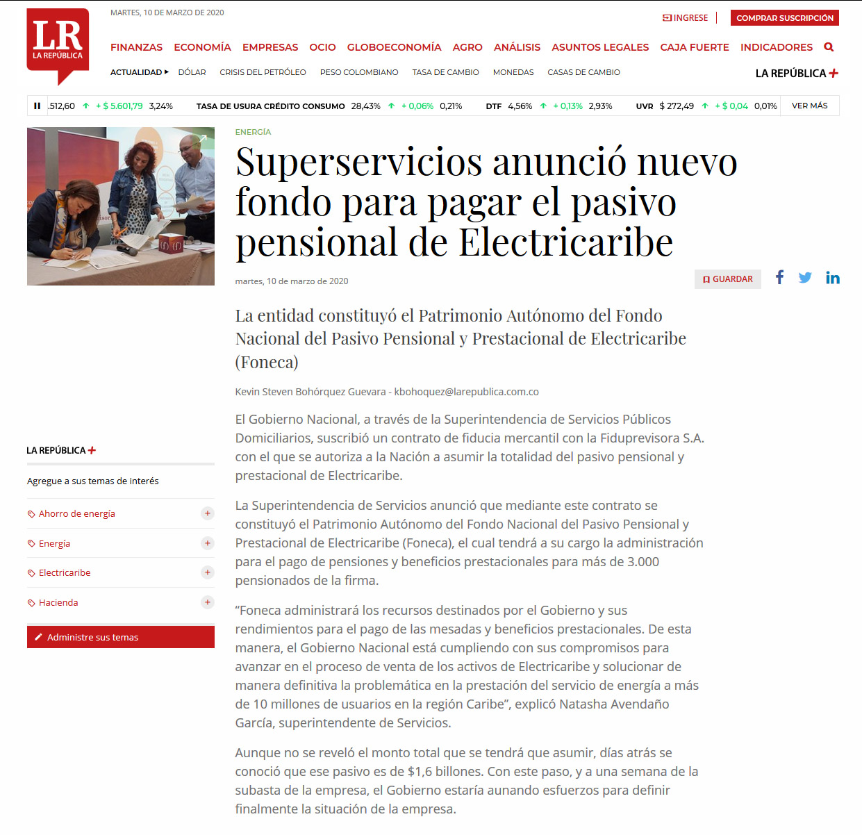 SUPERSERVICIOS ANUNCIÓ FONDO PARA PAGAR EL PASIVO PENSIONAL DE ELECTRICARIBE, LA REPÚBLICA CO