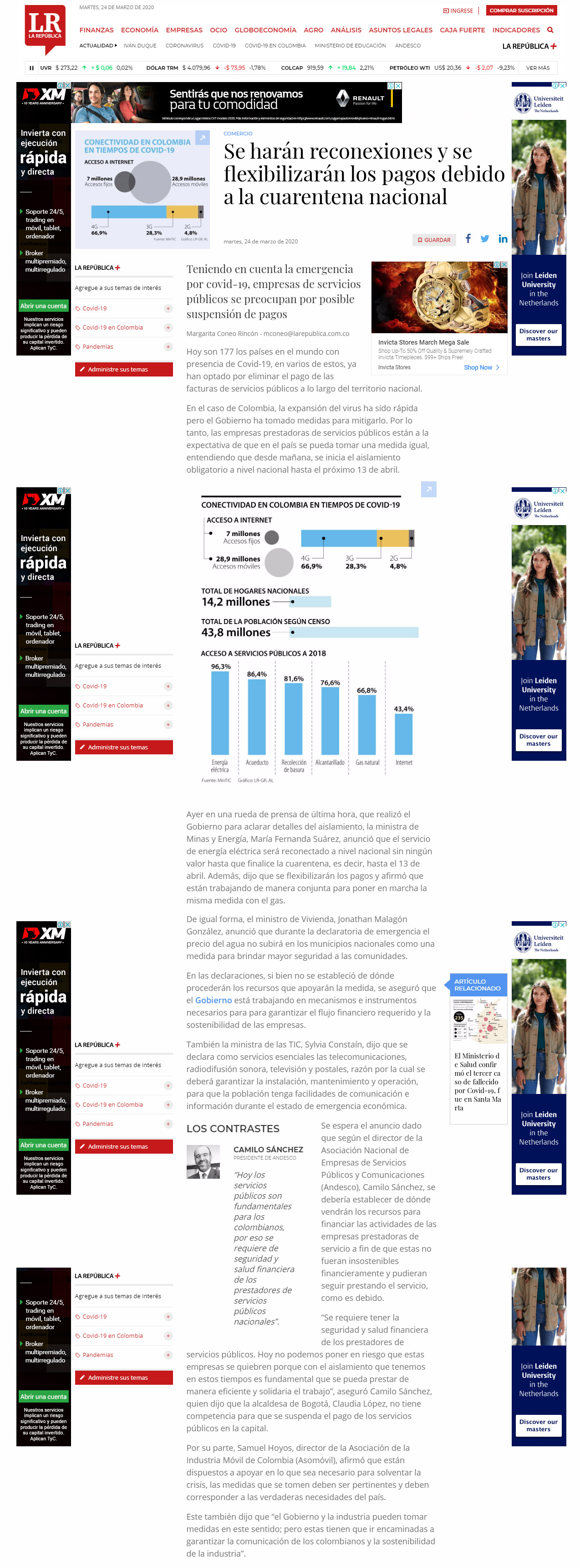 En el caso de Colombia, la expansión del virus ha sido rápida pero el Gobierno ha tomado medidas para mitigarlo. Por lo tanto, las empresas prestadoras de servicios públicos están a la expectativa de que en el país se pueda tomar una medida igual, entendiendo que desde mañana, se inicia el aislamiento obligatorio a nivel nacional hasta el próximo 13 de abril.