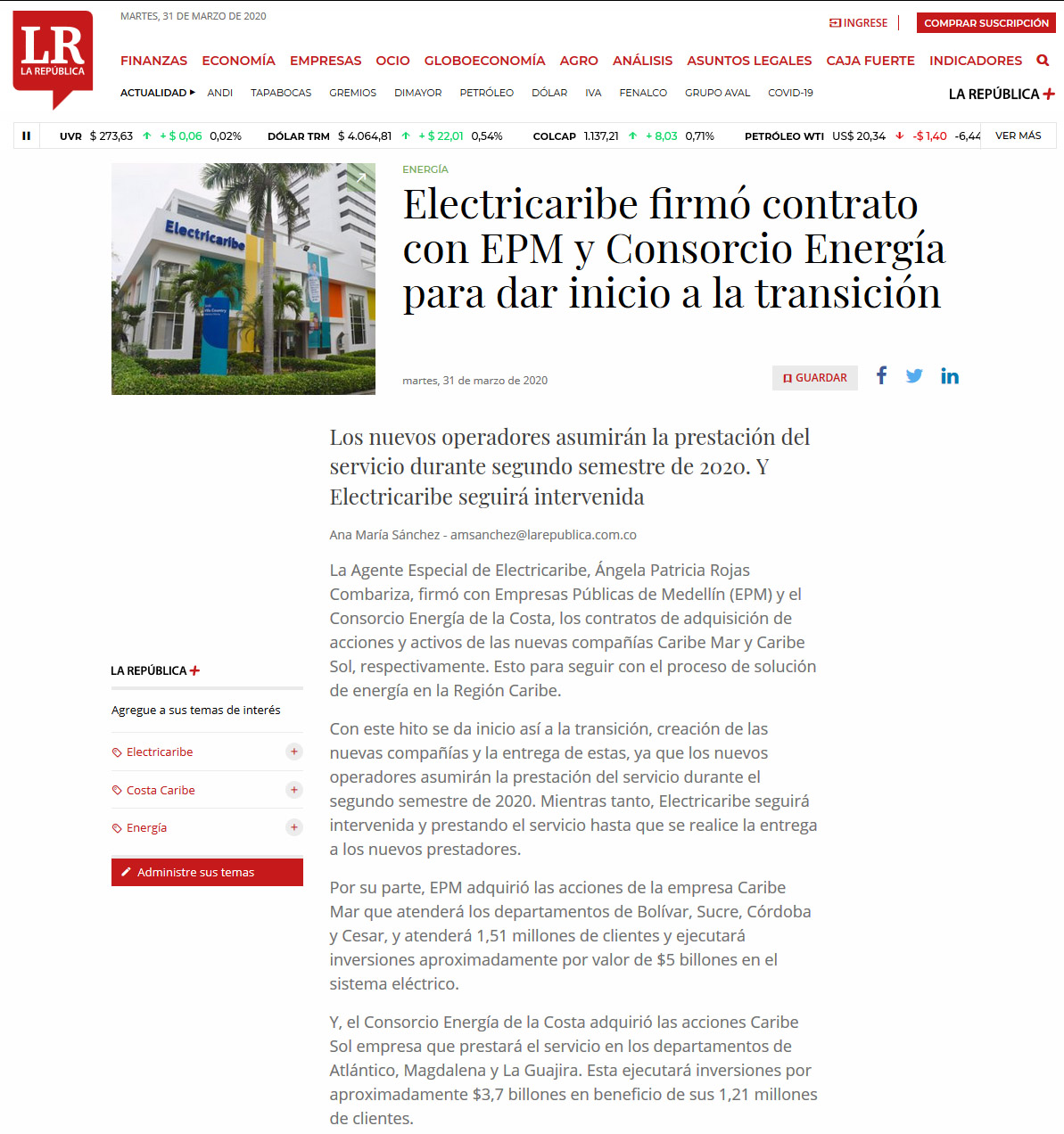 Electricaribe firmó contrato con EPM y Consorcio Energía, larepública co