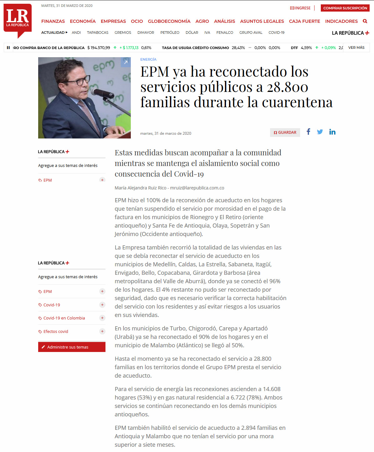 EPM hizo el 100% de la reconexión de acueducto en los hogares que tenían suspendido el servicio por morosidad en el pago de la factura en los municipios de Rionegro y El Retiro (oriente antioqueño) y Santa Fe de Antioquia, Olaya, Sopetrán y San Jerónimo (Occidente antioqueño).