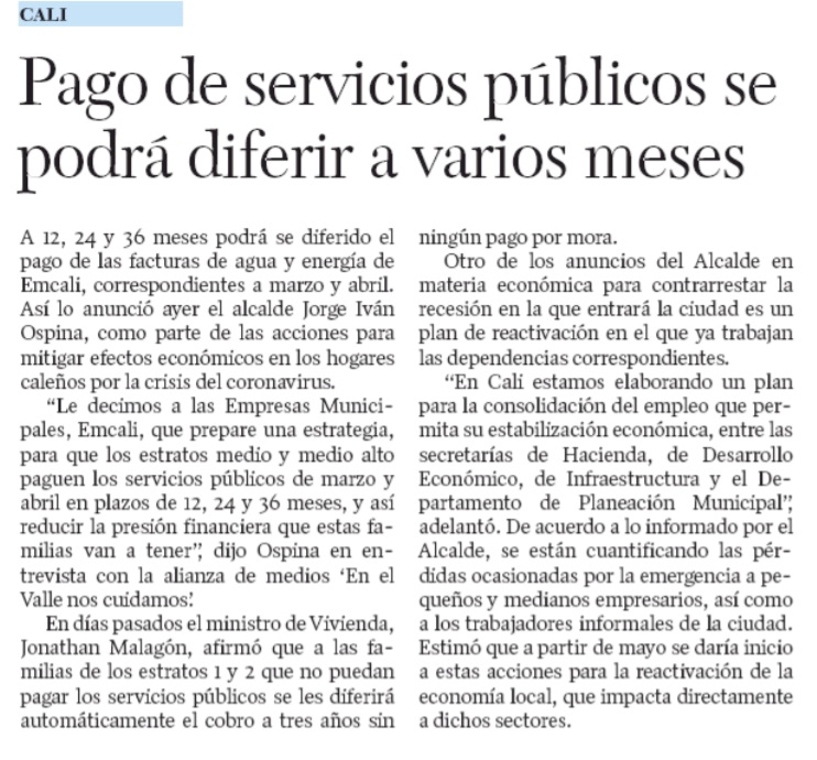 A 12, 24 y 36 meses podrá se diferido el pago de las facturas de agua y energía de Emcali, correspondientes a marzo y abril.  Así lo anunció este miércoles el alcalde Jorge Iván Ospina, como parte de las acciones para mitigar efectos económicos en los hogares caleños de la crisis por el coronavirus.