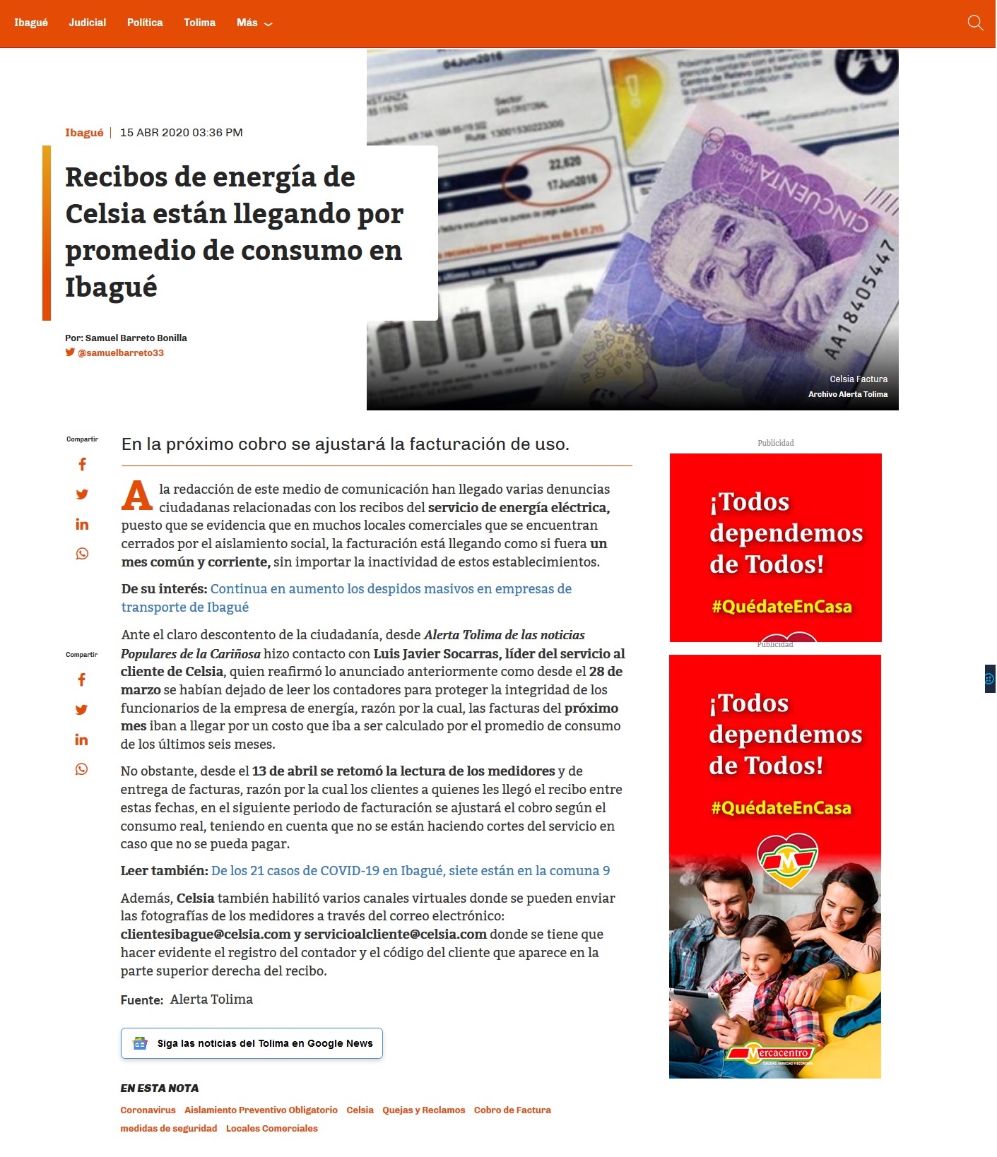 Ante las quejas de propietarios de locales comerciales por las facturas de energía a pesar de estar cerrados por la cuarentena del coronavirus, el líder del servicio al cliente de Celsia, Luis Javier Socarras, respondió que desde el 28 de marzo se habían dejado de leer los contadores para proteger la integridad de los funcionarios de la empresa de energía, razón por la cual las facturas del próximo mes iban a llegar por un costo que iba a ser calculado por el promedio de consumo.