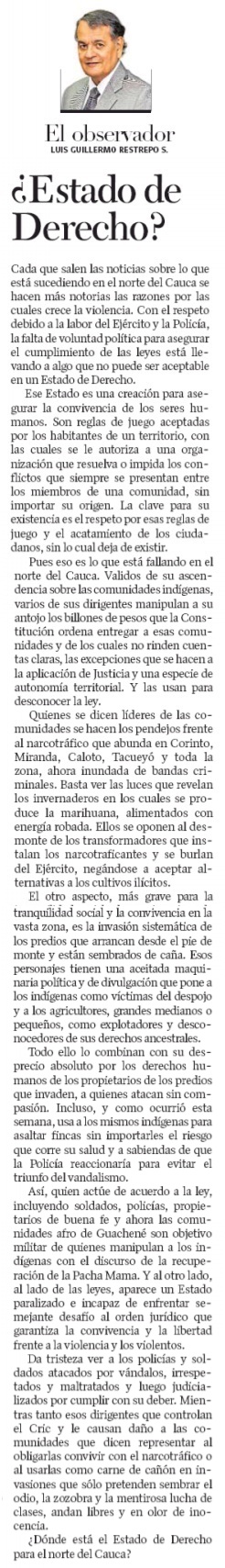 Cada que salen las noticias sobre lo que está sucediendo en el norte del Cauca se hacen más notorias las razones por las cuales crece la violencia. Con el respeto debido a la labor del Ejército y la Policía, la falta de voluntad política para asegurar el cumplimiento de las leyes está llevando a algo que no puede ser aceptable en un Estado de Derecho.