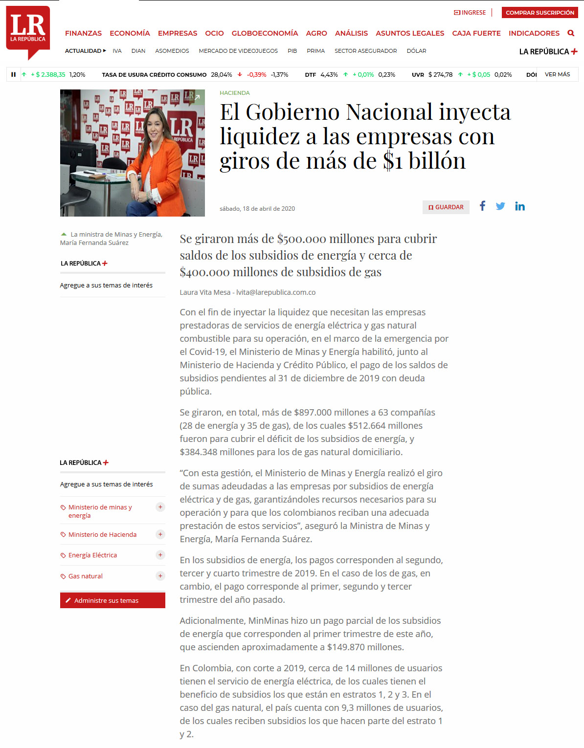 Con el fin de inyectar la liquidez que necesitan las empresas prestadoras de servicios de energía eléctrica y gas natural combustible para su operación, en el marco de la emergencia por el Covid-19, el Ministerio de Minas y Energía habilitó, junto al Ministerio de Hacienda y Crédito Público, el pago de los saldos de subsidios pendientes al 31 de diciembre de 2019 con deuda pública.