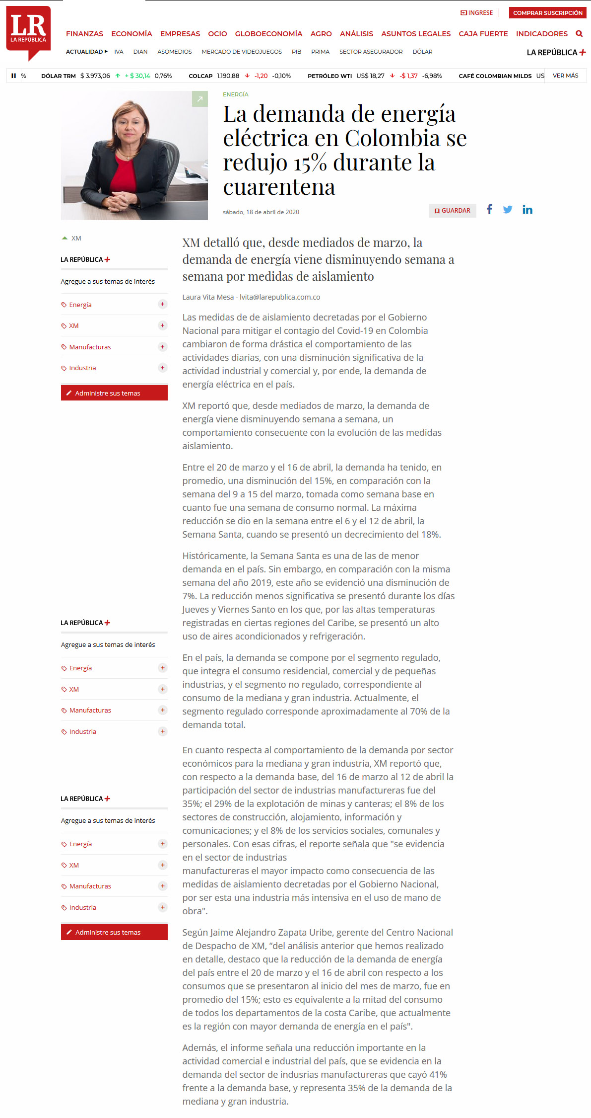 Las medidas de de aislamiento decretadas por el Gobierno Nacional para mitigar el contagio del Covid-19 en Colombia cambiaron de forma drástica el comportamiento de las actividades diarias, con una disminución significativa de la actividad industrial y comercial y, por ende, la demanda de energía eléctrica en el país.