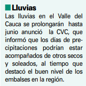 Las lluvias en el Valle del Cauca se prolongarán hasta junio anunció la CVC, que informó que los días de precipitaciones podrían estar acompañados de otros secos y soleados, al tiempo que destacó el buen nivel de los embalses en la región.