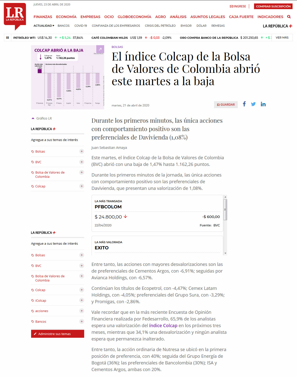índice Colcap de la Bolsa de Valores abrió a la baja, larepública co