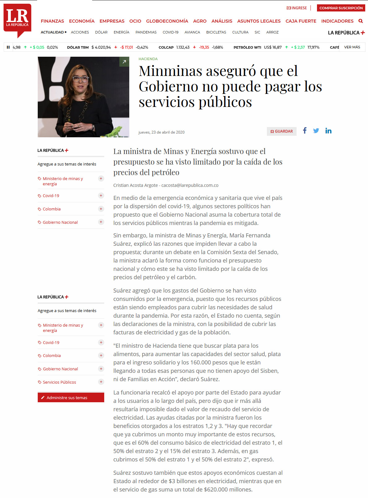 Minminas aseguró que el Gobierno no puede pagar los servicios públicos, larepública co