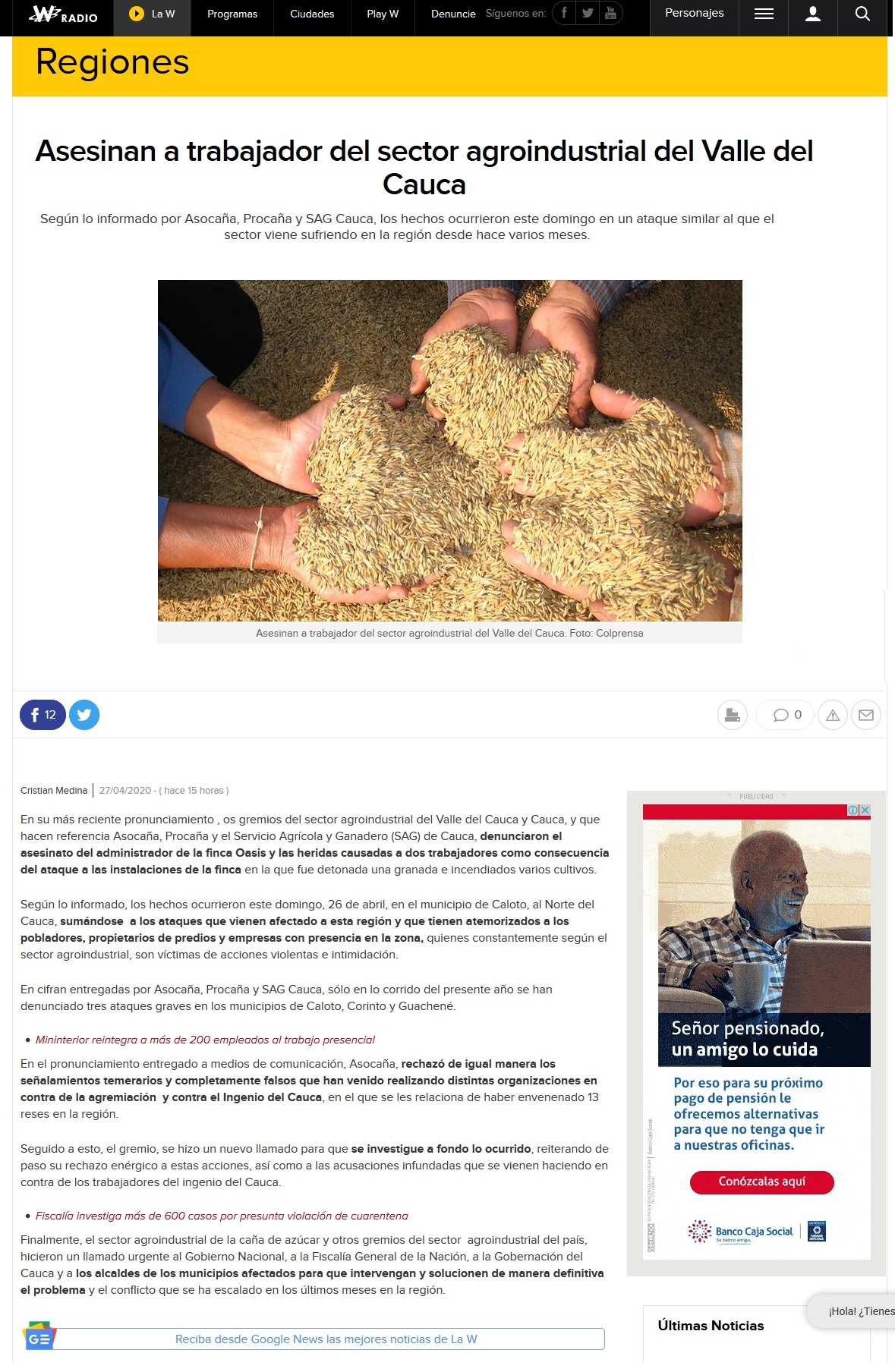 Los gremios del sector agroindustrial del Valle del Cauca y Cauca, y que hacen referencia Asocaña, Procaña y el Servicio Agrícola y Ganadero (SAG) de Cauca, denunciaron el asesinato del administrador de la finca Oasis y las heridas causadas a dos trabajadores como consecuencia del ataque a las instalaciones de la finca en la que fue detonada una granada e incendiados varios cultivos.