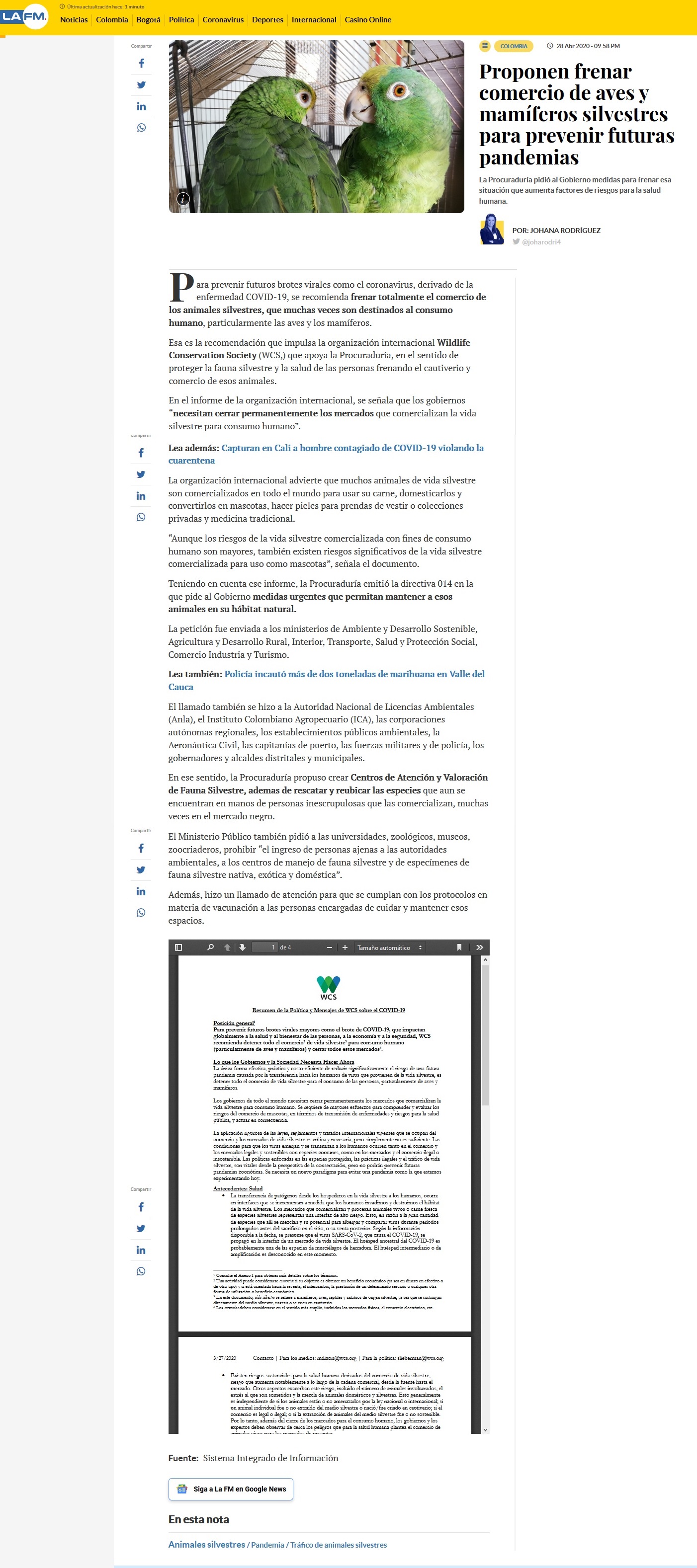 La organización internacional Wildlife Conservation Society, apoyada por la Procuraduría General, recomienda detener el comercio de los animales silvestres, que muchas veces son destinados al consumo humano, particularmente las aves y los mamíferos, como una forma de prevenir brotes del coronavirus.