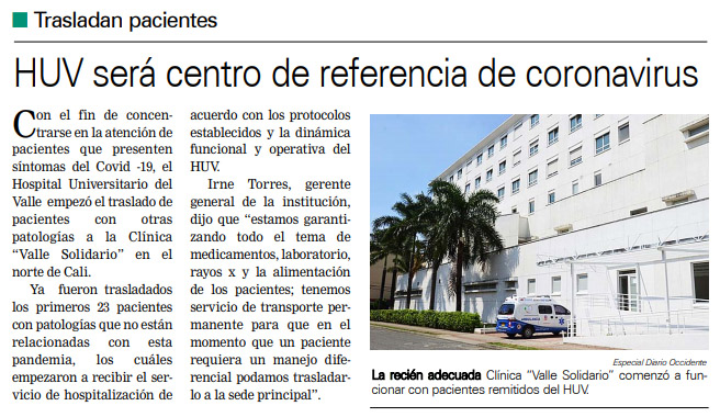 A la Clínica ‘Valle Solidario’, sede norte del Hospital Universitario del Valle, fueron trasladados los primeros 23 pacientes con patologías que no están relacionadas con COVID-19. Esto hace parte del plan para concentrar en la sede principal del HUV la atención de pacientes con Coronavirus.