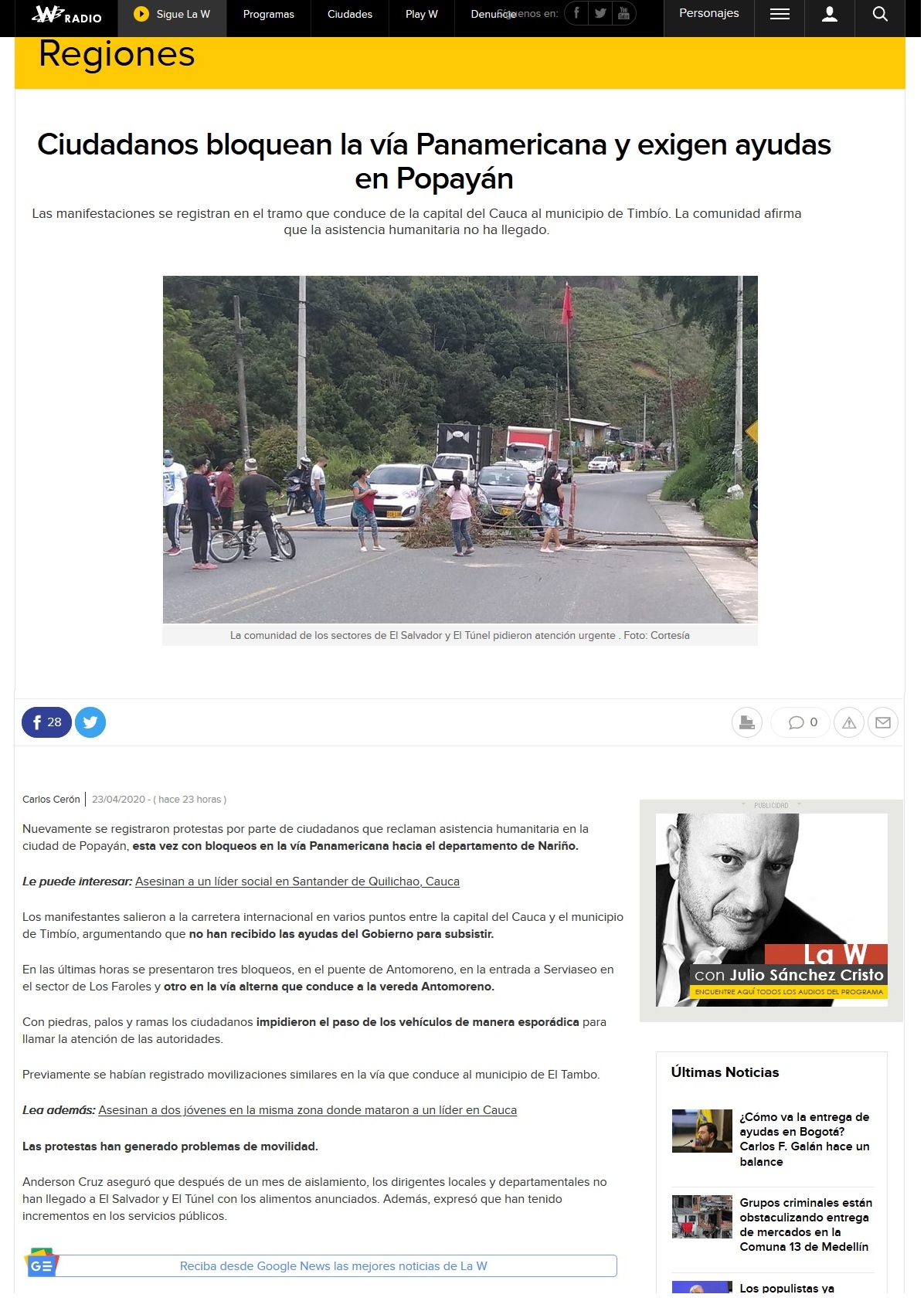 Nuevamente se registraron protestas por parte de ciudadanos payaneses que realizaron bloqueos en la vía Panamericana para reclamar asistencia humanitaria ante la emergencia por coronavirus.