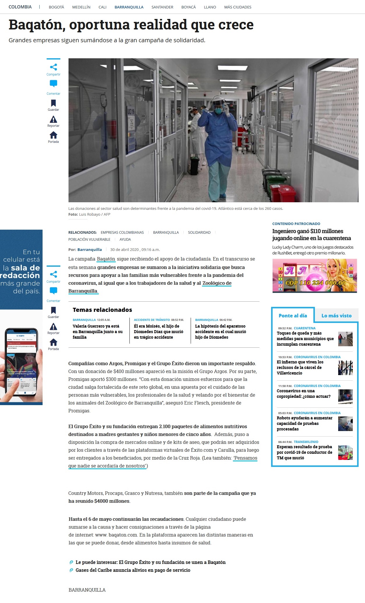 Promigas, Grupo Argos y el Grupo Éxito se unieron a la campaña Baqatón que busca recoger recursos para apoyar familias vulnerables, personal de salud y el zoológico de Barranquilla ante la emergencia por el coronavirus.