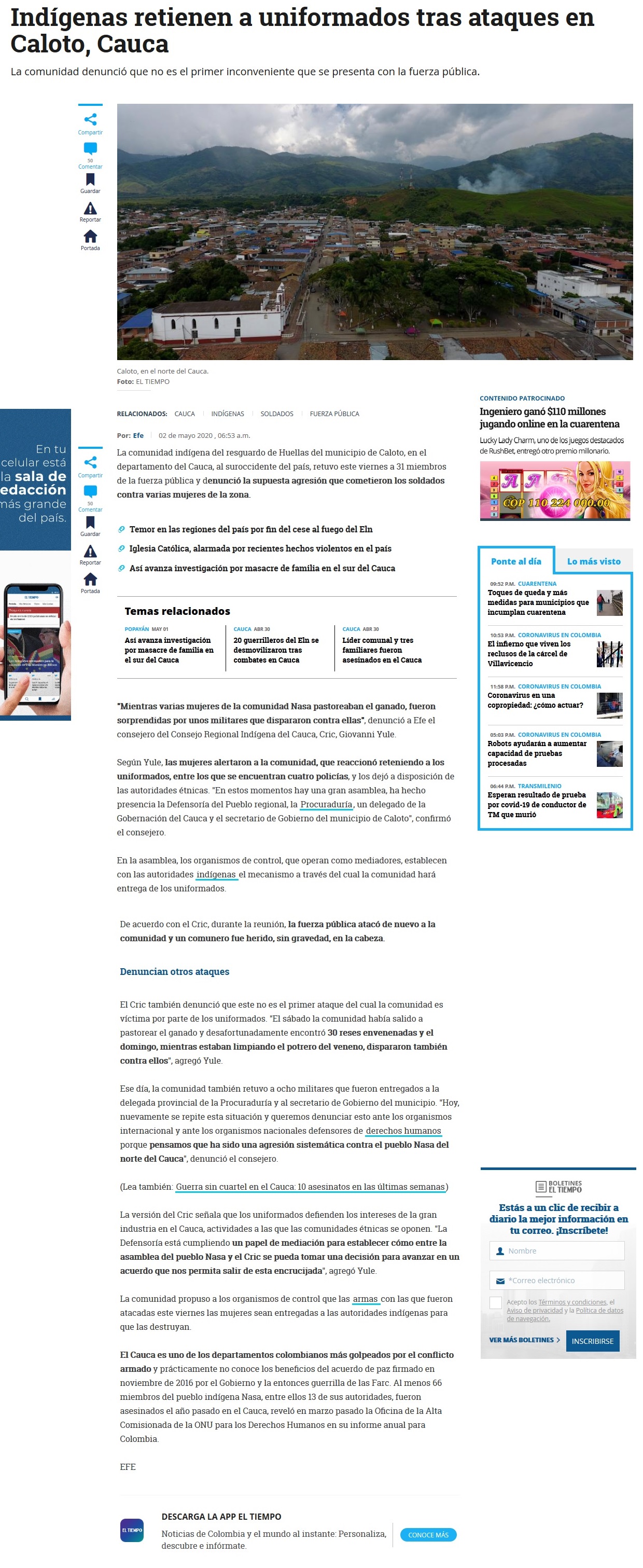 El Consejero Mayor del CRIC, Giovanni Yule denuncia que mientras mujeres de la comunidad Nasa pastoreaban unas reses fueron atacadas por militares. La guardia indígena reaccionó reteniendo a un grupo de militares que fueron luego entregados a la Defensoría del Pueblo.