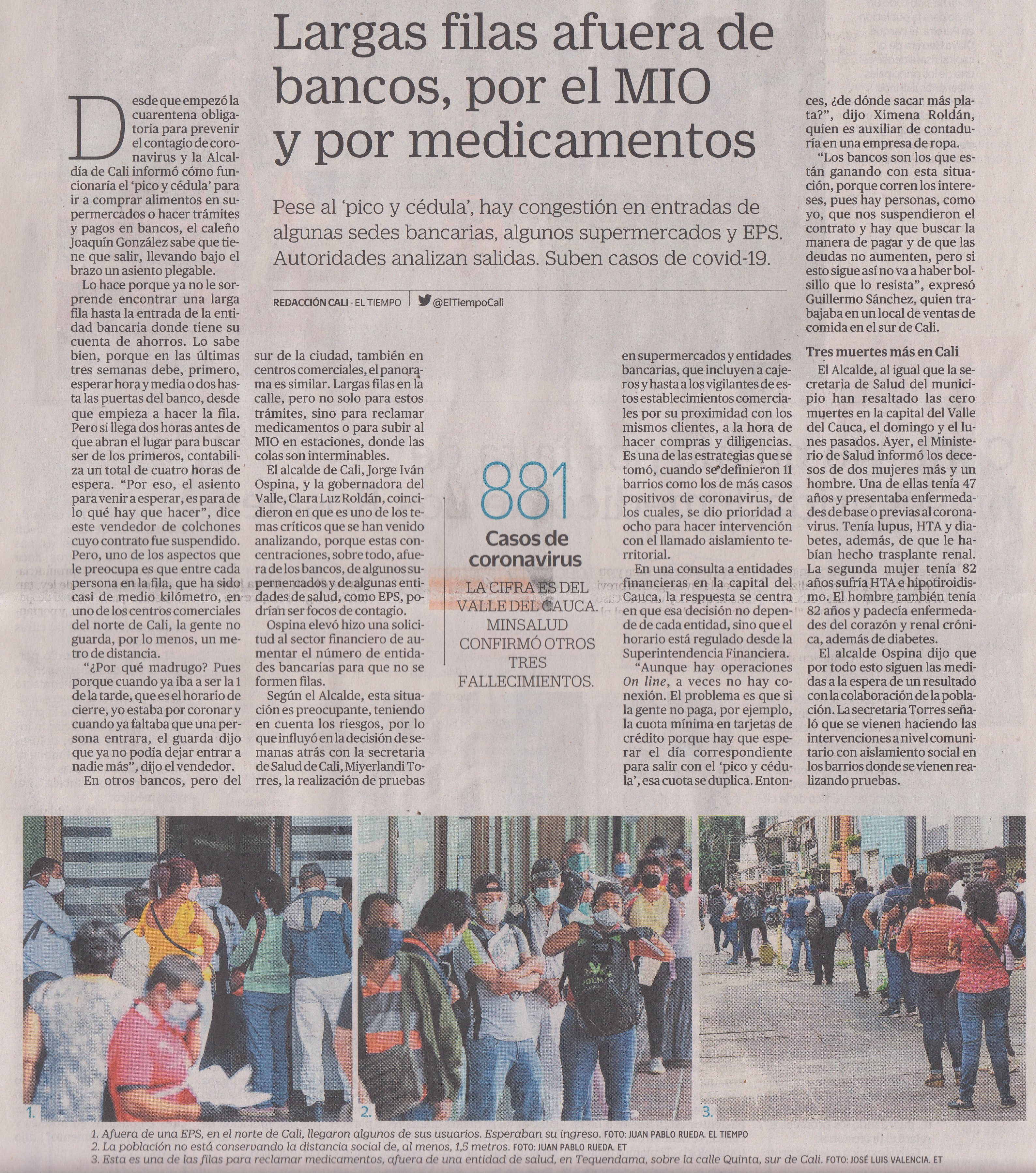 Largas filas afuera de bancos, por el MIO y por medicamentos, pag 2-1, El Tiempo