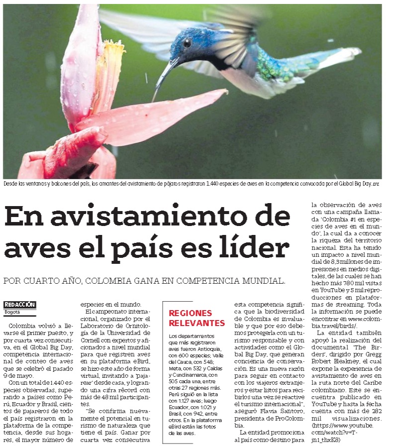 El país obtuvo por cuarta vez consecutiva el campeonato del Global Big Day con 1.140 especies registradas. Atlántico registró 133.