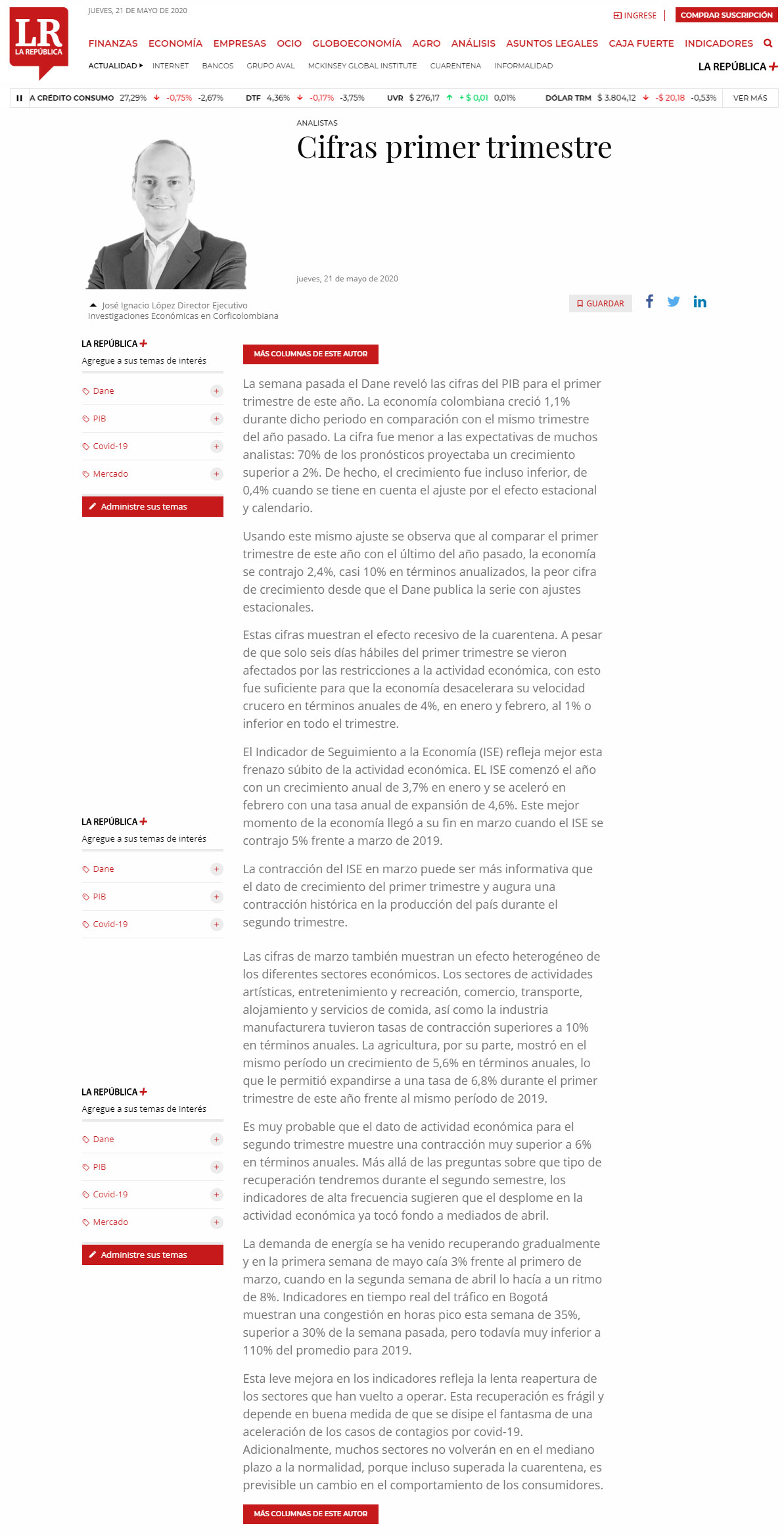 La semana pasada el Dane reveló las cifras del PIB para el primer trimestre de este año. La economía colombiana creció 1,1% durante dicho periodo en comparación con el mismo trimestre del año pasado. La cifra fue menor a las expectativas de muchos analistas: 70% de los pronósticos proyectaba un crecimiento superior a 2%. De hecho, el crecimiento fue incluso inferior, de 0,4% cuando se tiene en cuenta el ajuste por el efecto estacional y calendario.