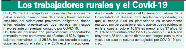 El 38,7% de los trabajadores rurales de plantaciones de palma aceitera, banano, caña de azúcar y flores, sectores excluidos del aislamiento preventivo obligatorio, tienen enfermedades preexistentes que representan riesgos mayores ante un eventual contagio por COVID-19. Del total de personas con preexistencias, concentrados primordialmente en mayores de 43 años, el 52% sigue trabajando normalmente, el 25,3% ha sido enviado a casa y sigue recibiendo el salario y el 20% está en vacaciones.