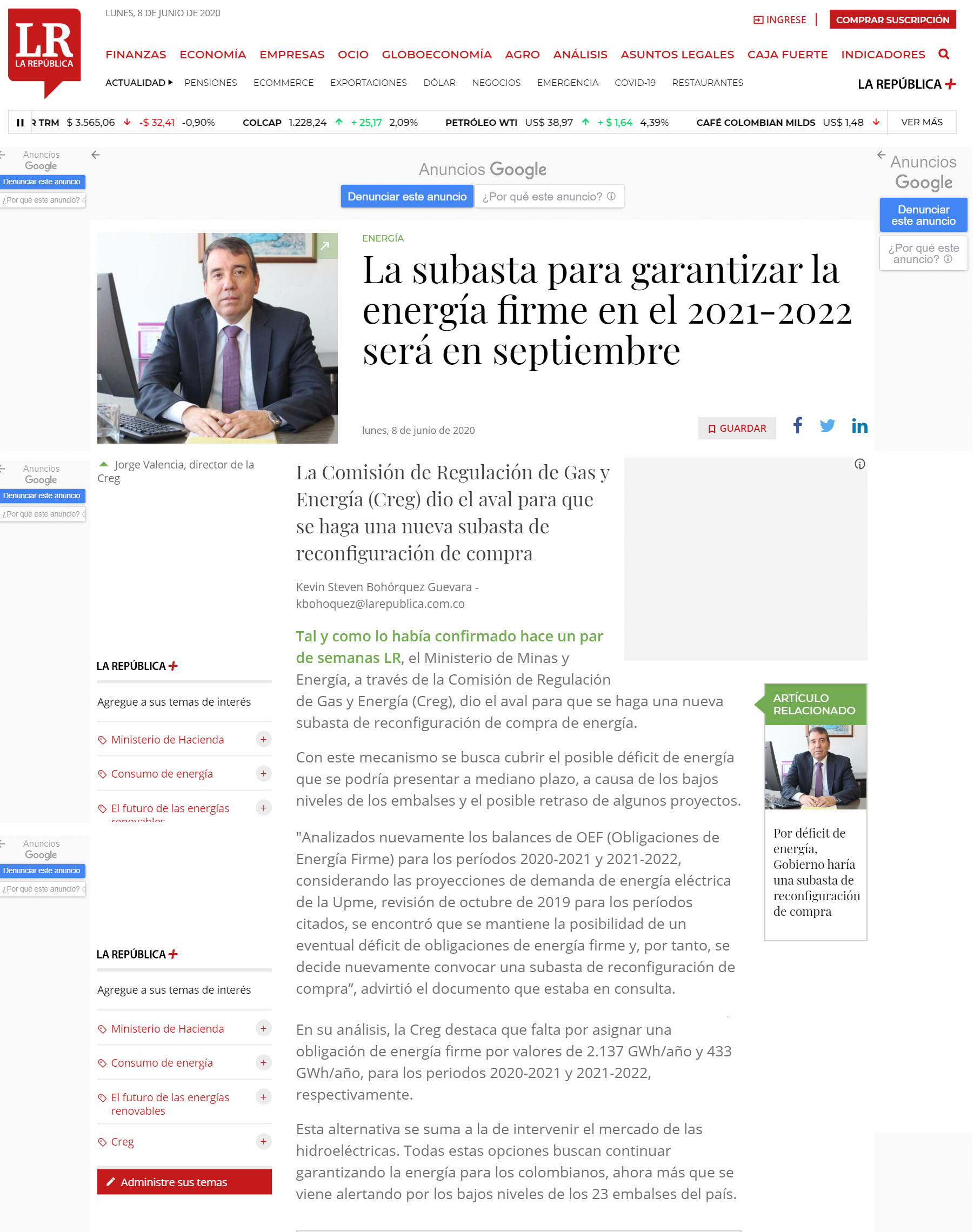 Subasta de energía en el 2021-2022 será en septiembre, larepública co