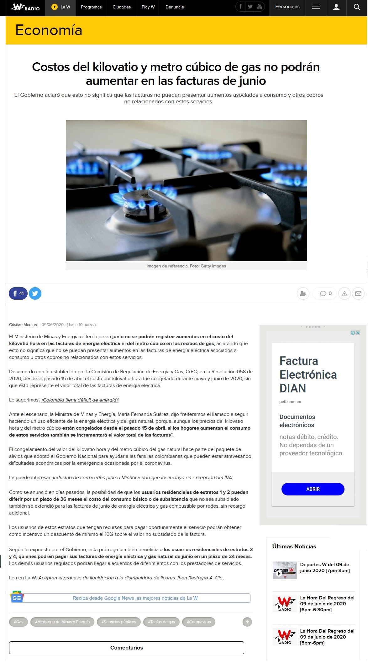 El Ministerio de Minas y Energía reiteró que en junio no se podrán registrar incrementos en el costo del kilovatio hora en las facturas de energía eléctrica ni del metro cúbico en los recibos de gas, aclarando que esto no significa que no se puedan presentar aumentos en las facturas de energía eléctrica asociados al consumo u otros cobros no relacionados con estos servicios.
