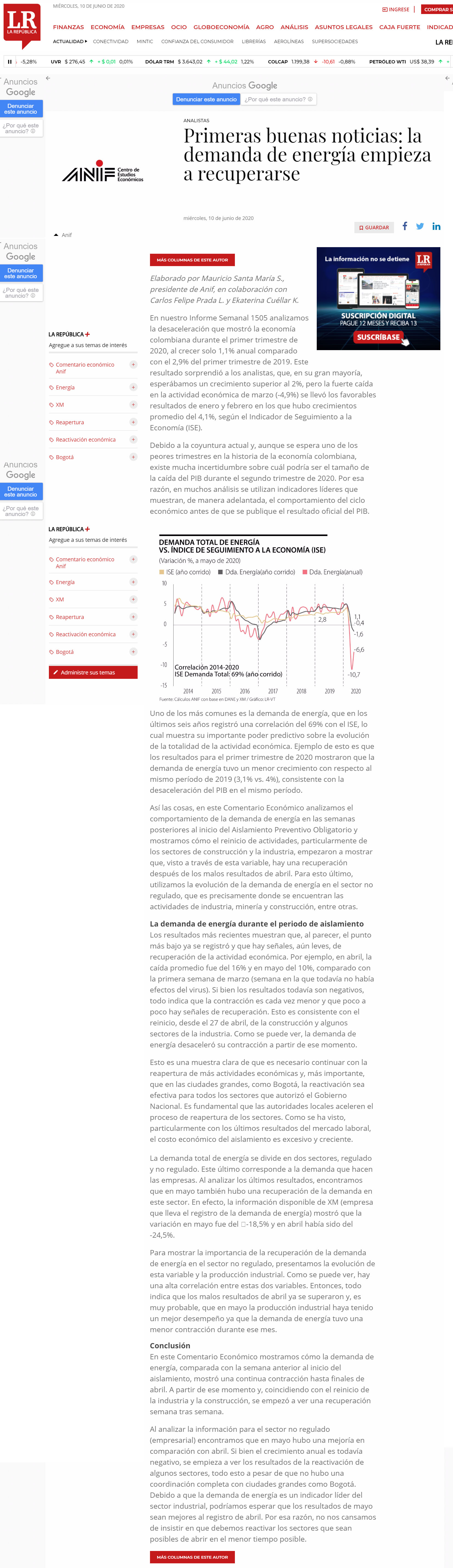 En nuestro Informe Semanal 1505 analizamos la desaceleración que mostró la economía colombiana durante el primer trimestre de 2020, al crecer solo 1,1% anual comparado con el 2,9% del primer trimestre de 2019. Este resultado sorprendió a los analistas, que, en su gran mayoría, esperábamos un crecimiento superior al 2%, pero la fuerte caída en la actividad económica de marzo (-4,9%) se llevó los favorables resultados de enero y febrero en los que hubo crecimientos promedio del 4,1%, según el Indicador de Seguimiento a la Economía (ISE).