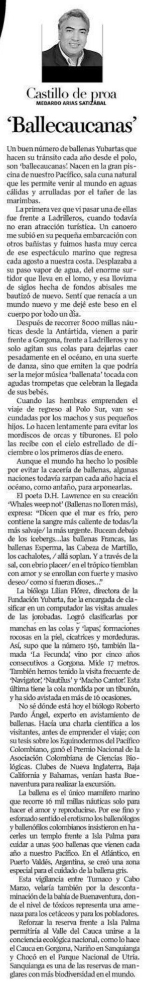 Un buen número de ballenas Yubartas que hacen su tránsito cada año desde el polo, son ‘ballecaucanas’. Nacen en la gran piscina de nuestro Pacífico, sala cuna natural que les permite venir al mundo en aguas cálidas y arrulladas por el tañer de las marimbas.