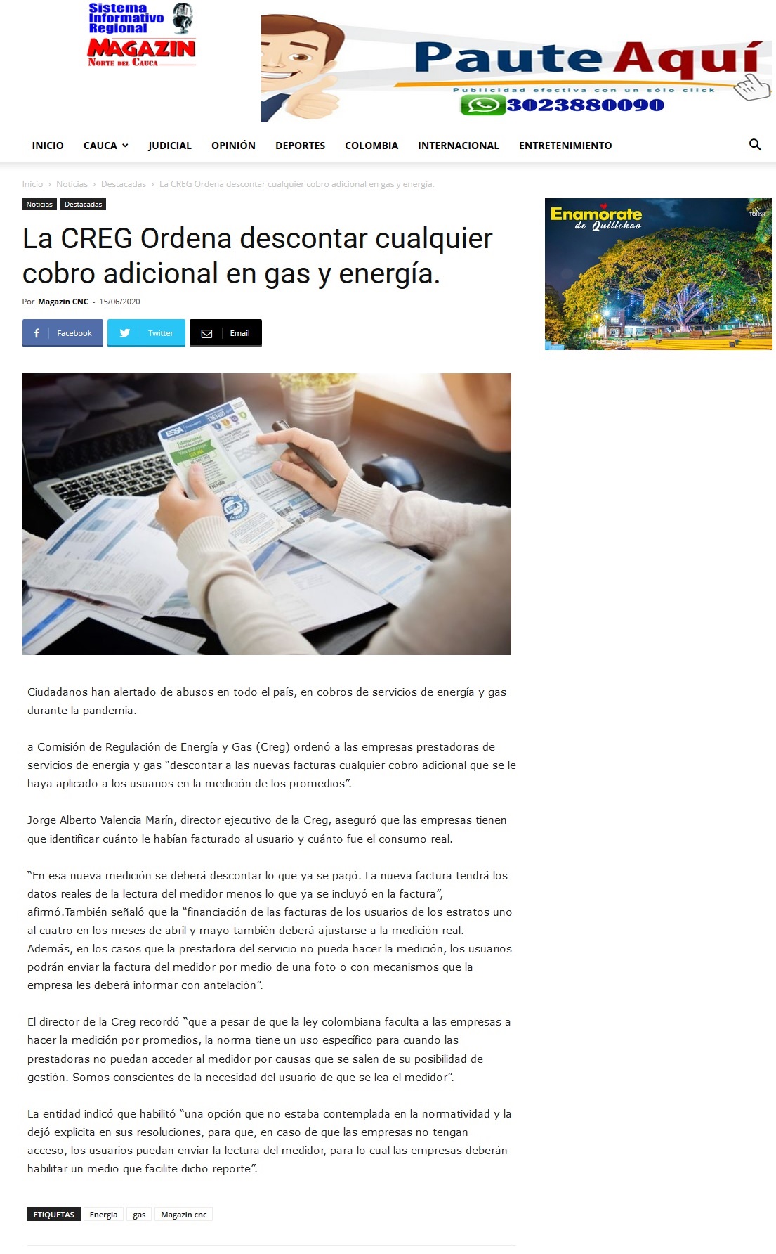 La CREG ordenó a las empresas prestadoras de servicios de energía y gas “descontar a las nuevas facturas cualquier cobro adicional que se le haya aplicado a los usuarios en la medición de los promedios”. Añadió que “financiación de las facturas de los usuarios de los estratos uno al cuatro en los meses de abril y mayo también deberá ajustarse a la medición real. Además, en los casos que la prestadora del servicio no pueda hacer la medición, los usuarios podrán enviar la factura del medidor por medio de una foto o con mecanismos que la empresa les deberá informar con antelación”.